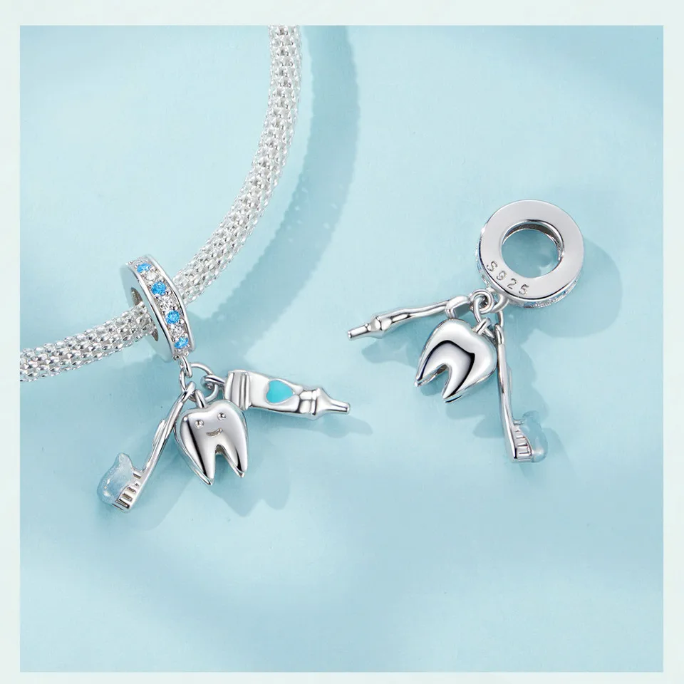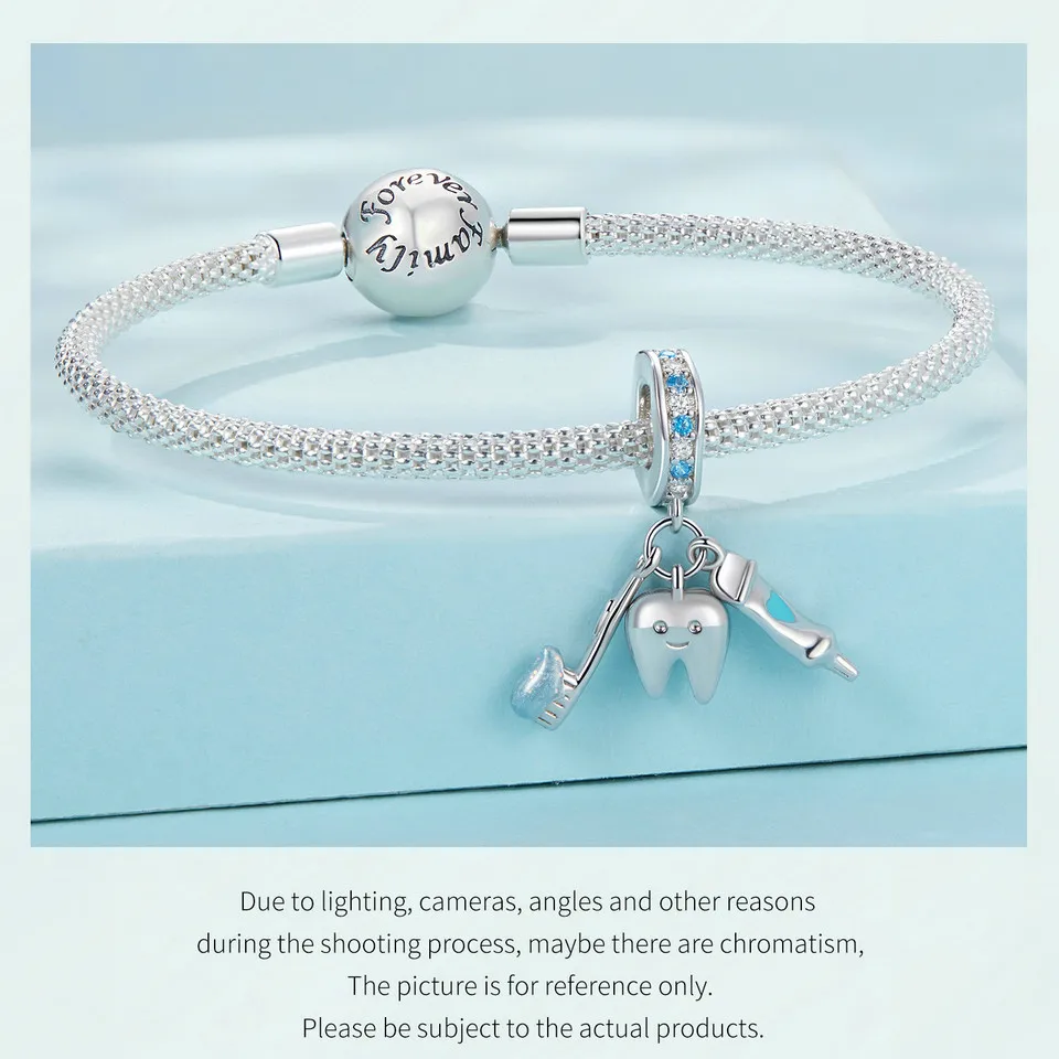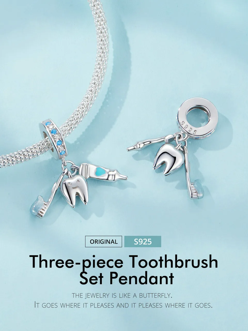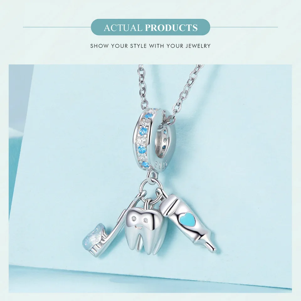 WOSTU 925 Sterling Silver Dente Spazzolino Dentifricio Ciondolo Pendenti e Ciondoli Perlina Blu Misura Braccialetti Originali Collane FAI DA TE Creazione di Gioielli