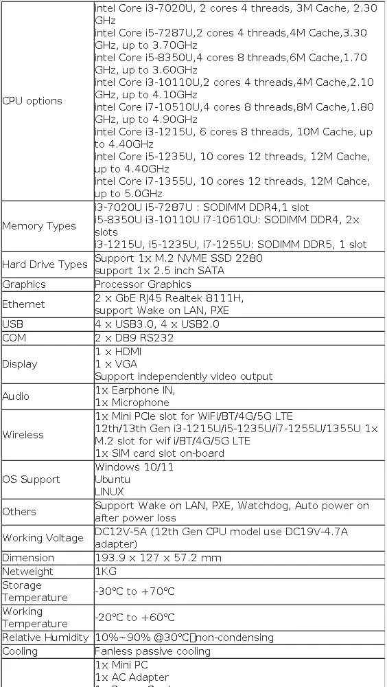 XCY Mini PC industriale IoT senza ventola Intel Core i5-1335U 2x COM RS232 2x LAN 8x USB WiFi SIM 4G LTE Windows 10/11 Linux PXE WOL