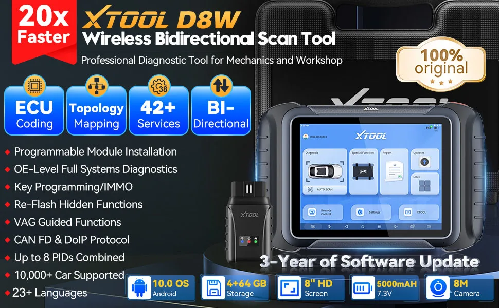 Strumento diagnostico Bluetooth XTOOL D8W versione più recente del 20220, mirato per la meccanica professionale, con codifica ECU avanzata, servizi Bi-D42+, programmazione IMMO/Key, con connessione WIFI intelligente, supporta protocolli DoIP e CAN FD, FCA AUTOAUTH.Potente configurazione di base:🔥3 anni di aggiornamento software🔥Mappa intelligente della topologia🔥Sistemi Android 10.0🔥Touchscreen da 8”🔥Batteria da 5000 mAh, 7,3 V🔥Risoluzione 1024 x 768🔥Processore CPU a 4 core da 1,5 GHz🔥4G+ 64G