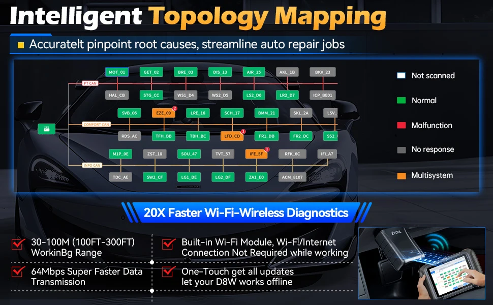 XTOOL D8W Scanner diagnostico automatico Nuova mappatura intuitiva del modulo topologica aggiunta, avendo tutto in vista sulla struttura di comunicazione tra i moduli con un solo clic per visualizzare tutti i codici di errore, le funzioni esecutive e visualizzare direttamente i dati in tempo reale nella grafia.Aiuta i tecnici a risparmiare tempo e fatica!L’efficienza della riparazione del negozio è migliorata almeno del 60%!Nota: non disponibile per tutti i veicoli