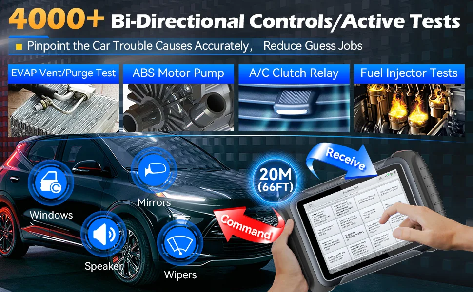 🔷Test EVAP 🔷Prova di compressione 🔷Accendere/spegnere la ventola del radiatore 🔷Frizione A/C On/Off 🔷Pompa del carburante 🔷Test serratura finestra/specchio/porta 🔷Test di pompa e valore 🔷Test luci interne ed esterne 🔷Test del clacson sonoro