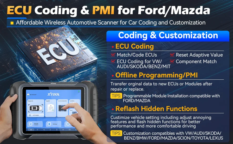 Lo strumento diagnostico Bluetooth XTOOL D8W viene fornito con la codifica ECU per Audi, VW, Skoda per eseguire la codifica ECU, la corrispondenza dei componenti, il ripristino adattivo dei dati;Funzioni flash nascoste per Ford, Lincoln, Mazda, BMW, VW, Audi, Skoda, Toyota, Lexus, ecc.per ottimizzare le prestazioni del veicolo e personalizzare le impostazioni dell’auto, come disabilitare l’allarme della cintura di sicurezza/avvio automatico/luce di marcia diurna e limitatore di velocità massima, ecc.; PMI per Ford, Lincoln, Mazda per copiare il codice in moduli usati.