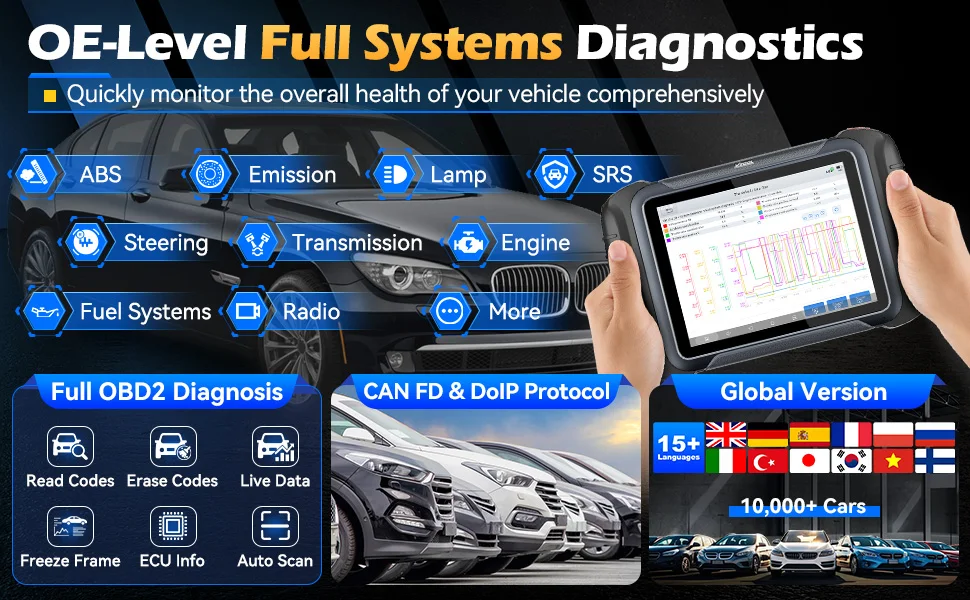 Compatibile con più veicoli con protocollo CAN FD (per veicoli GM dopo il 2020) (adattatore CAN FD NON è necessario acquistarlo separatamente); Funzione DOIP compatibile con il telaio BMW E/F/G, per Jaguar, per le marche di veicoli Land Rover.