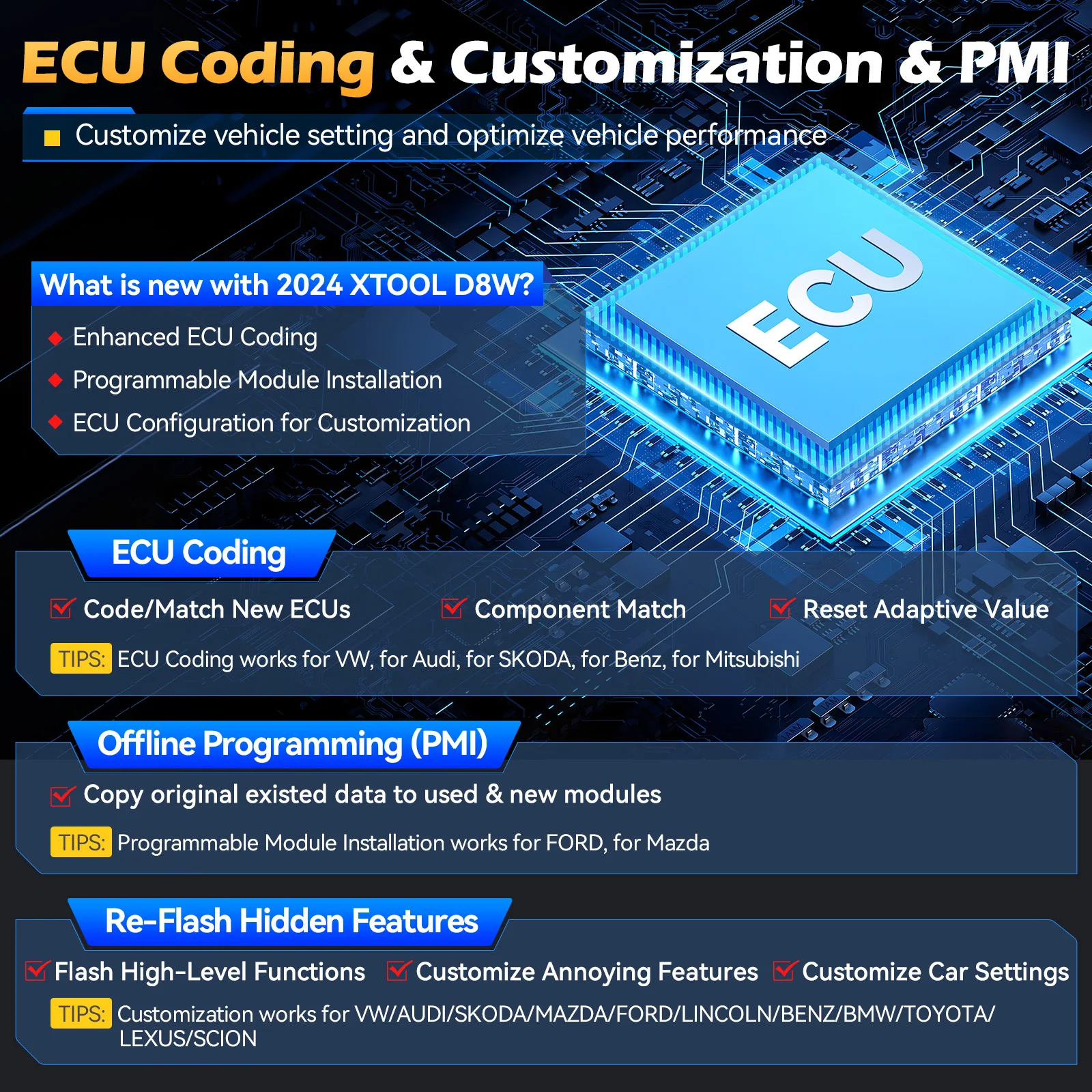 Lo strumento diagnostico Bluetooth XTOOL D8W viene fornito con la codifica ECU per Audi, VW, Skoda per eseguire la codifica ECU, la corrispondenza dei componenti, il ripristino adattivo dei dati;Funzioni flash nascoste per Ford, Lincoln, Mazda, BMW, VW, Audi, Skoda, Toyota, Lexus, ecc.per ottimizzare le prestazioni del veicolo e personalizzare le impostazioni dell’auto, come disabilitare l’allarme della cintura di sicurezza/avvio automatico/luce di marcia diurna e limitatore di velocità massima, ecc.; PMI per Ford, Lincoln, Mazda per copiare il codice in moduli usati.