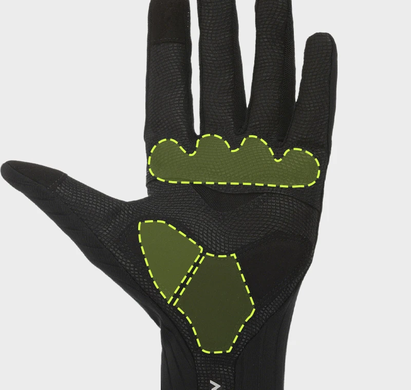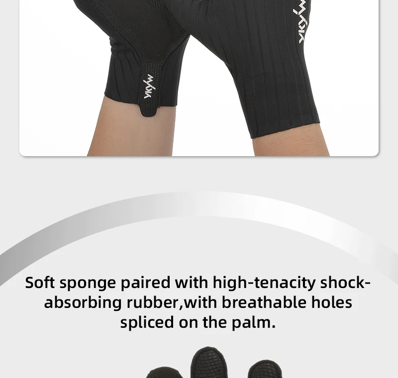•Spugna morbida abbinata a gomma ammortizzante ad alta tenacità, con fori traspiranti giuntati sul palmo.