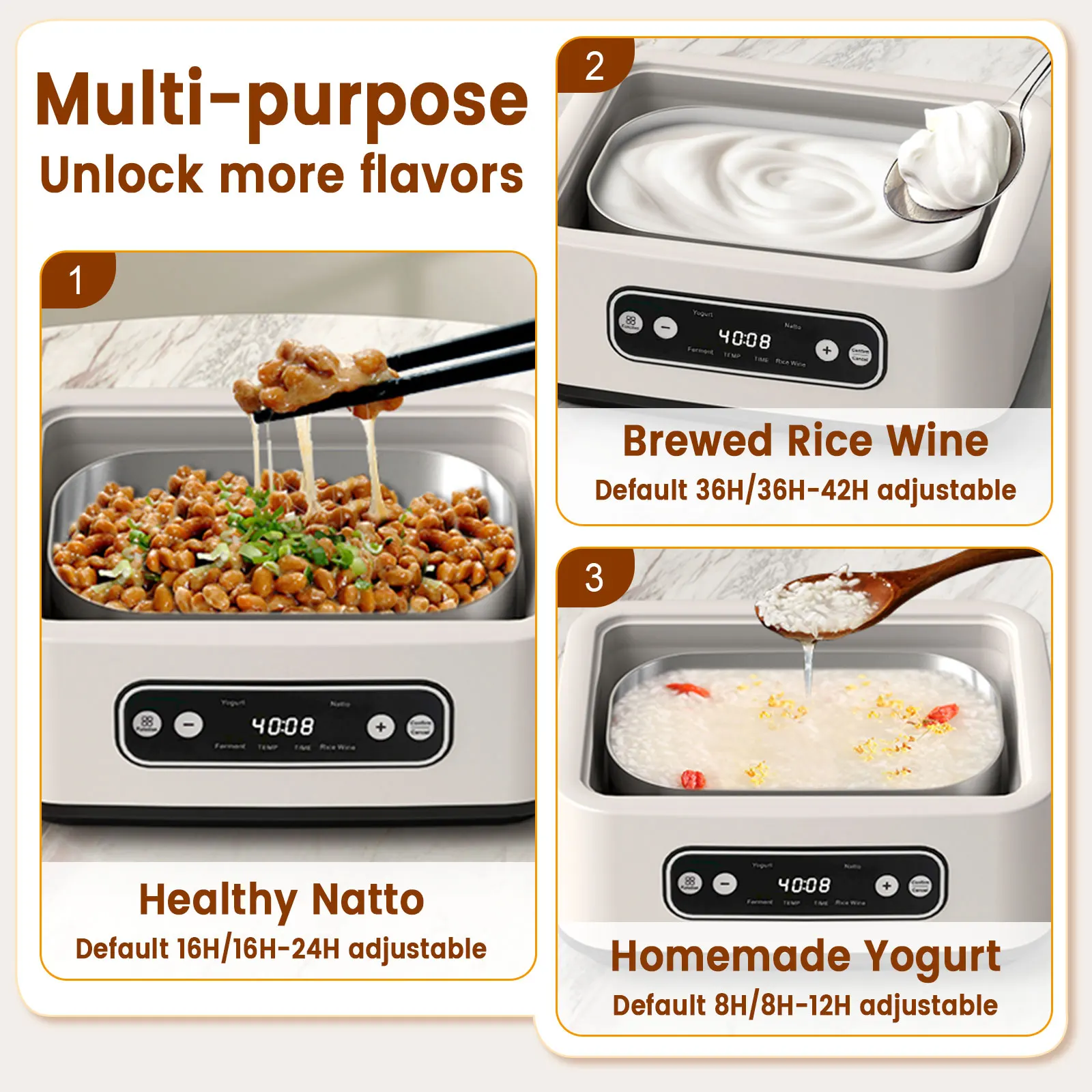 ✅Multifunzionale: questa yogurtiera può preparare non solo yogurt, ma anche vino di riso e natto.Puoi regolare il tempo di preparazione in base ai tuoi gusti, garantendo ogni volta la consistenza e l’acidità perfette.L’impostazione predefinita per preparare lo yogurt è 8 ore (regolabile da 8-12 ore), l’impostazione predefinita per preparare il natto è 16 ore (regolabile da 16-24 ore) e l’impostazione predefinita per preparare il vino di riso è 36 ore (regolabile da 36 -42 ore).