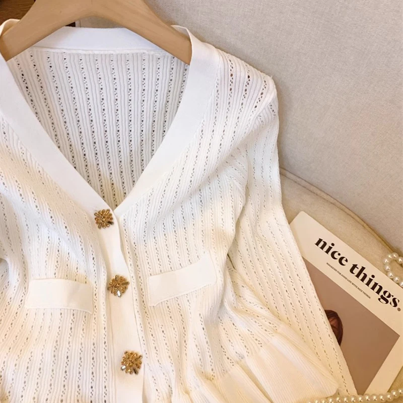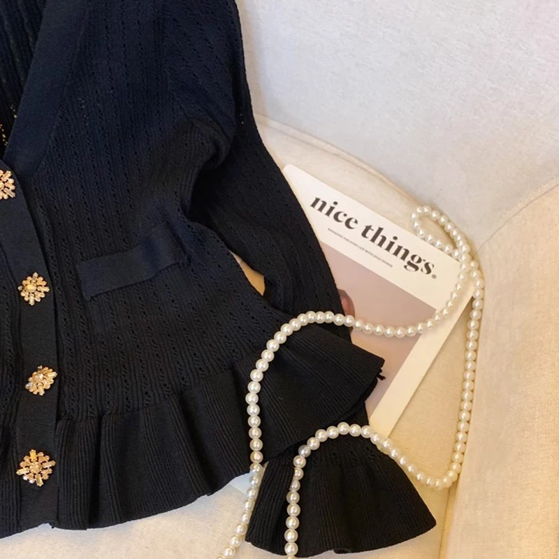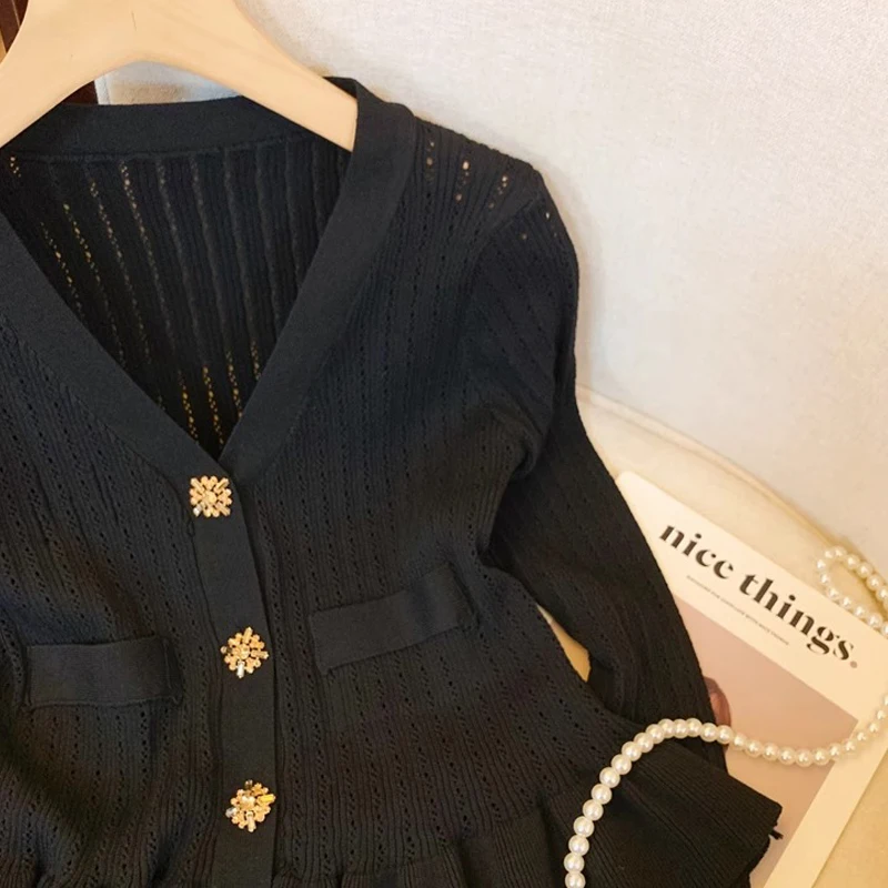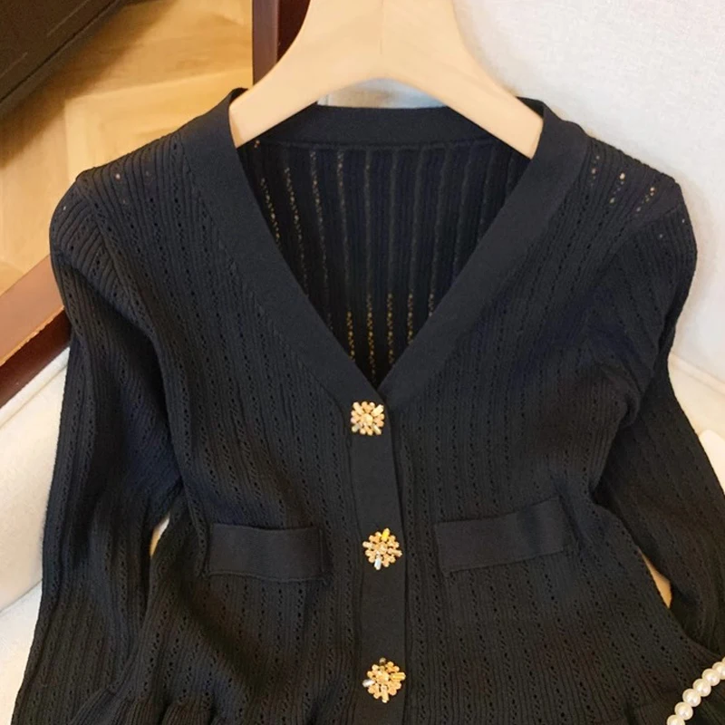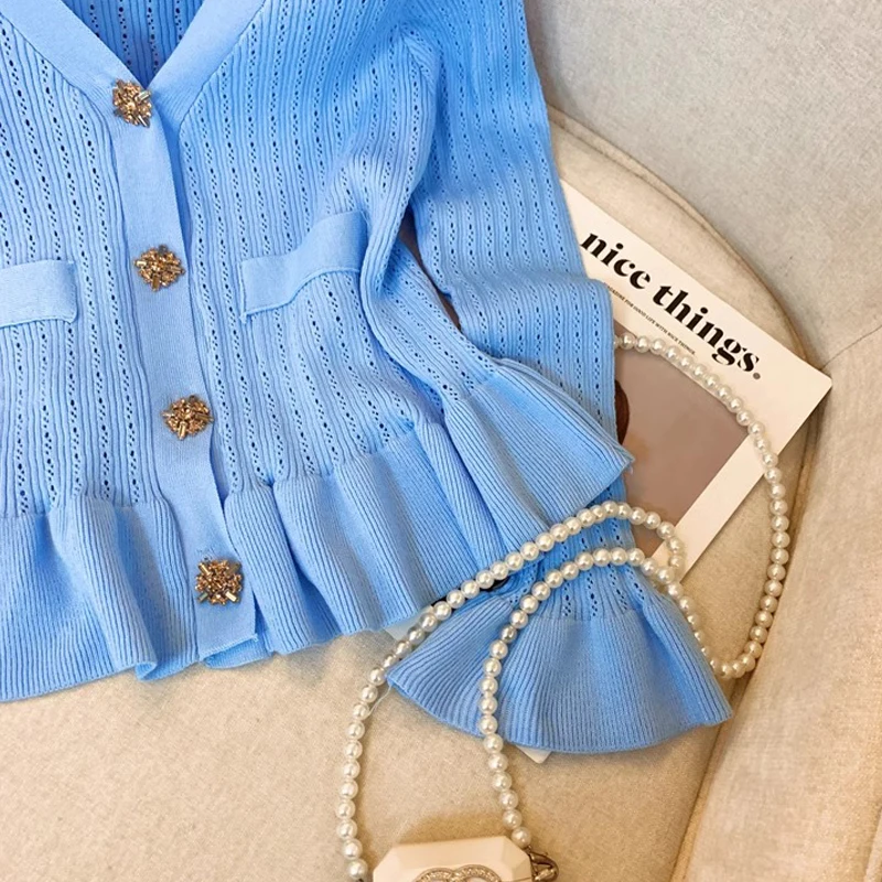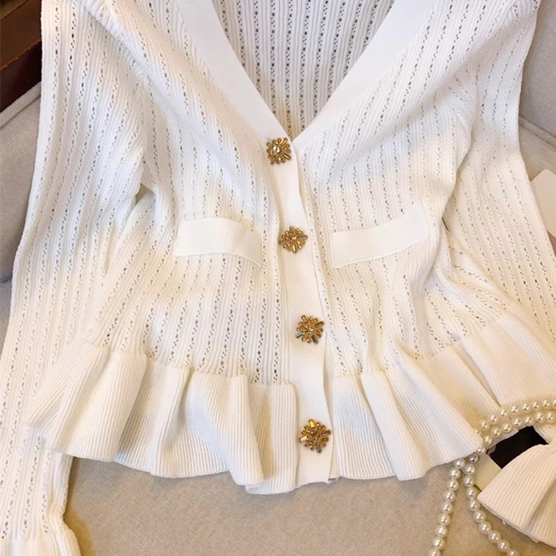 4 recensioni per YuooMuoo Cardigan da donna 2025 Autunno Bottoni di lusso Scollo a V Vita sottile Increspato Top in maglia Chic Fashion Lady Maglioni Camicie