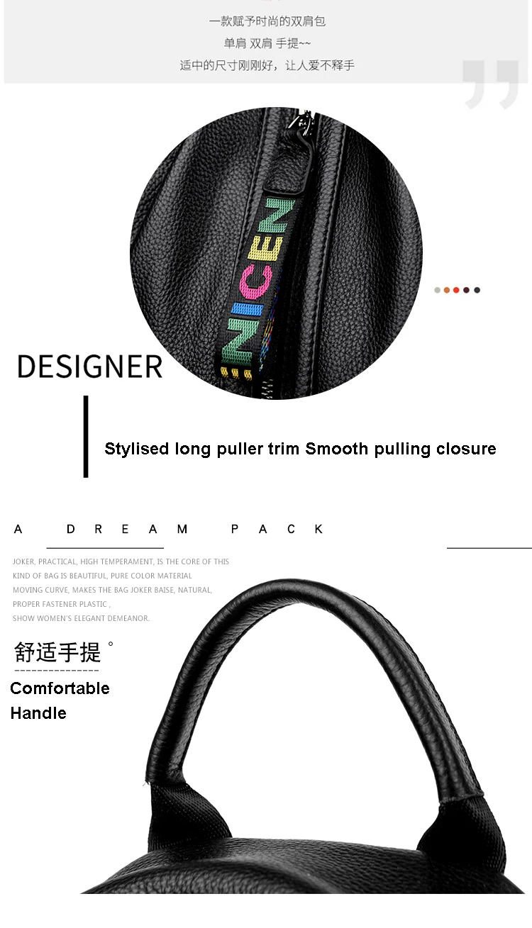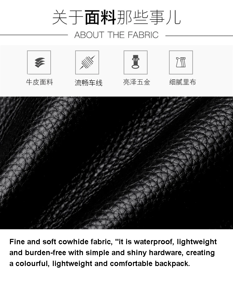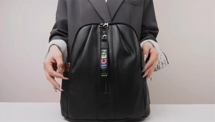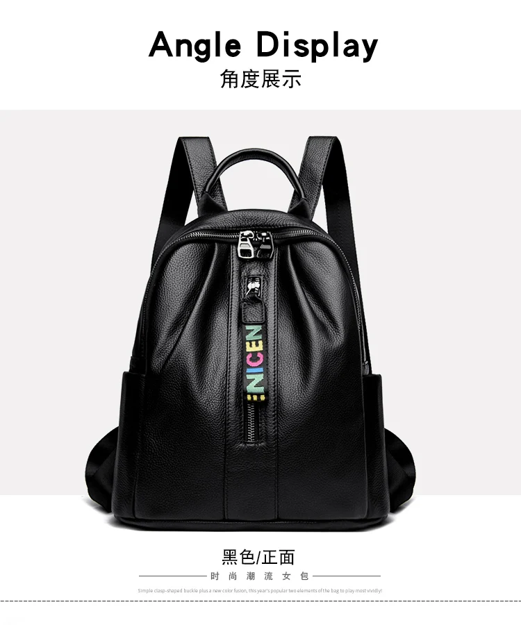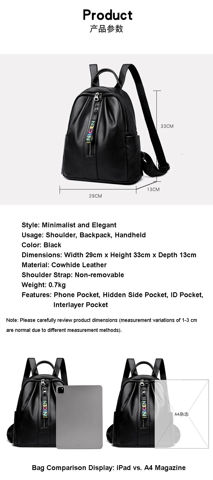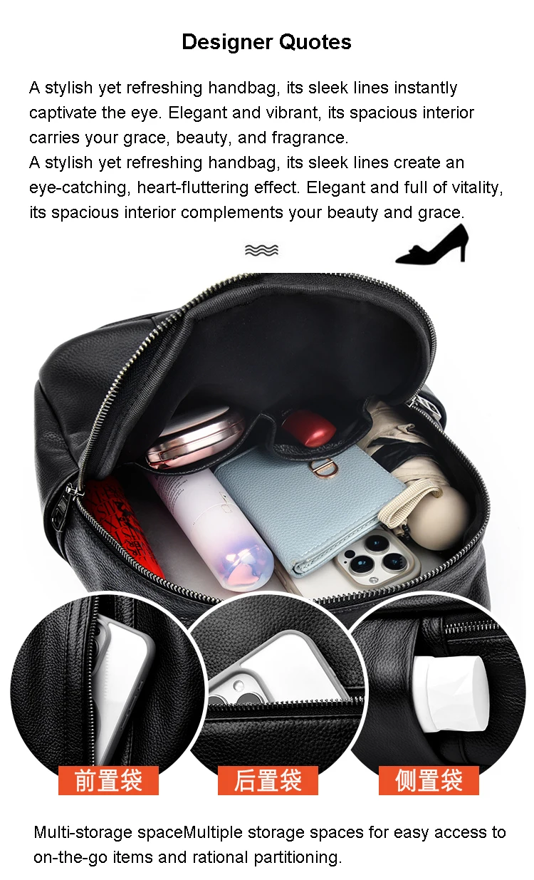 I. Fashion Backpack ProductBrand and Positioning: Emphasizes a minimalist and elegant aesthetic, suitable for daily commuting, leisure outings, and other scenarios, balancing practicality with visual appeal.Appearance and Details: Crafted from black cowhide leather with a refined texture and durable construction; the sleek and sophisticated design features multiple zippers (main zipper + side zipper) ensuring secure storage while enhancing organization efficiency through compartmentalization.II. Styling and VersatilityThis backpack effortlessly complements commuting and light business attire:• Black leather harmonizes with the subdued tones of suits, making it suitable for professional settings and meetings.• Minimalist design with vibrant accents injects energy into your look, preventing monotonous outfits.III. Functionality and Usage RecommendationsCapacity and Practicality:The backpack's structured form and multi-layer design accommodate daily commutes (laptop, documents, water bottle) or short trips (shopping, mini-getaways), offering both ample storage and easy organization.This black backpack centers on minimalist design and practical functionality, making it an excellent choice for elevating everyday outfits while ensuring ample storage. It's particularly suited for those seeking understated style and efficient commuting.