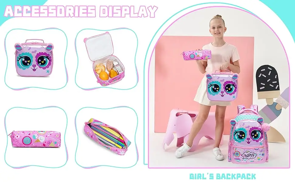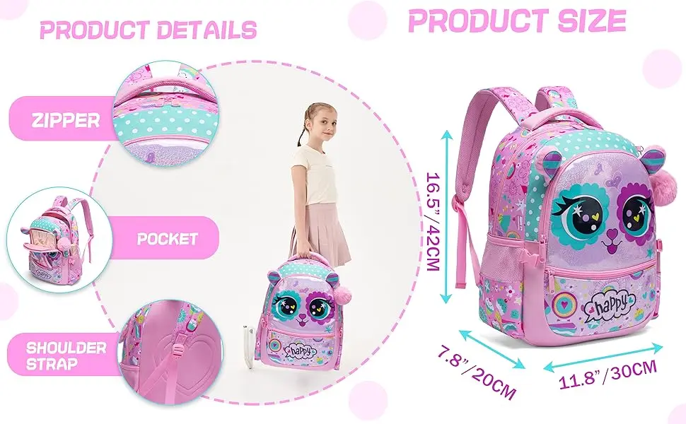 💝 Zaino scolastico per ragazze: dimensioni dello zaino: 16,5*11,8*7″ Portapranzo: 9*8*4″ Astuccio: 9″.