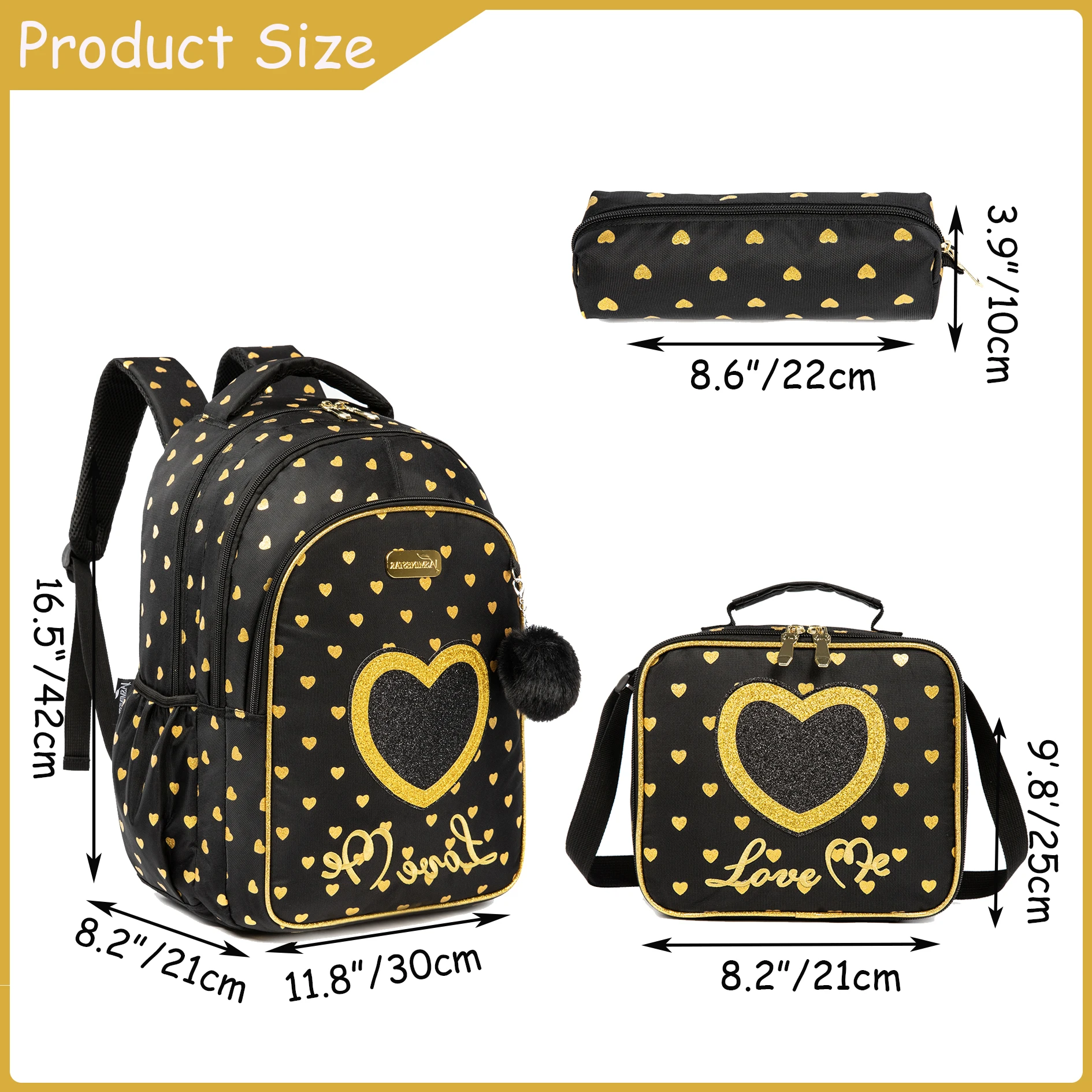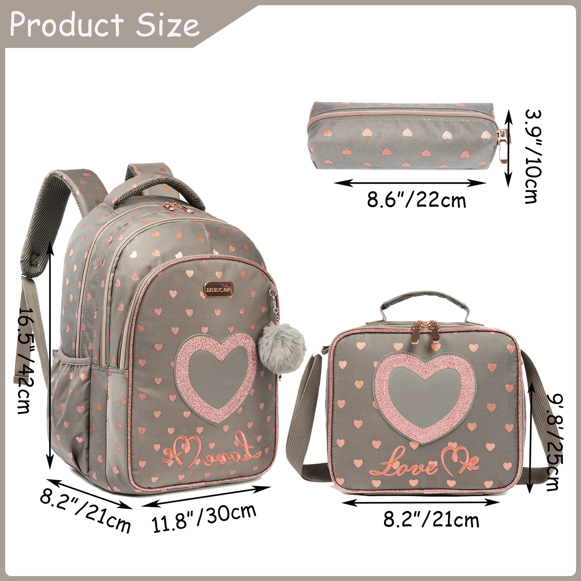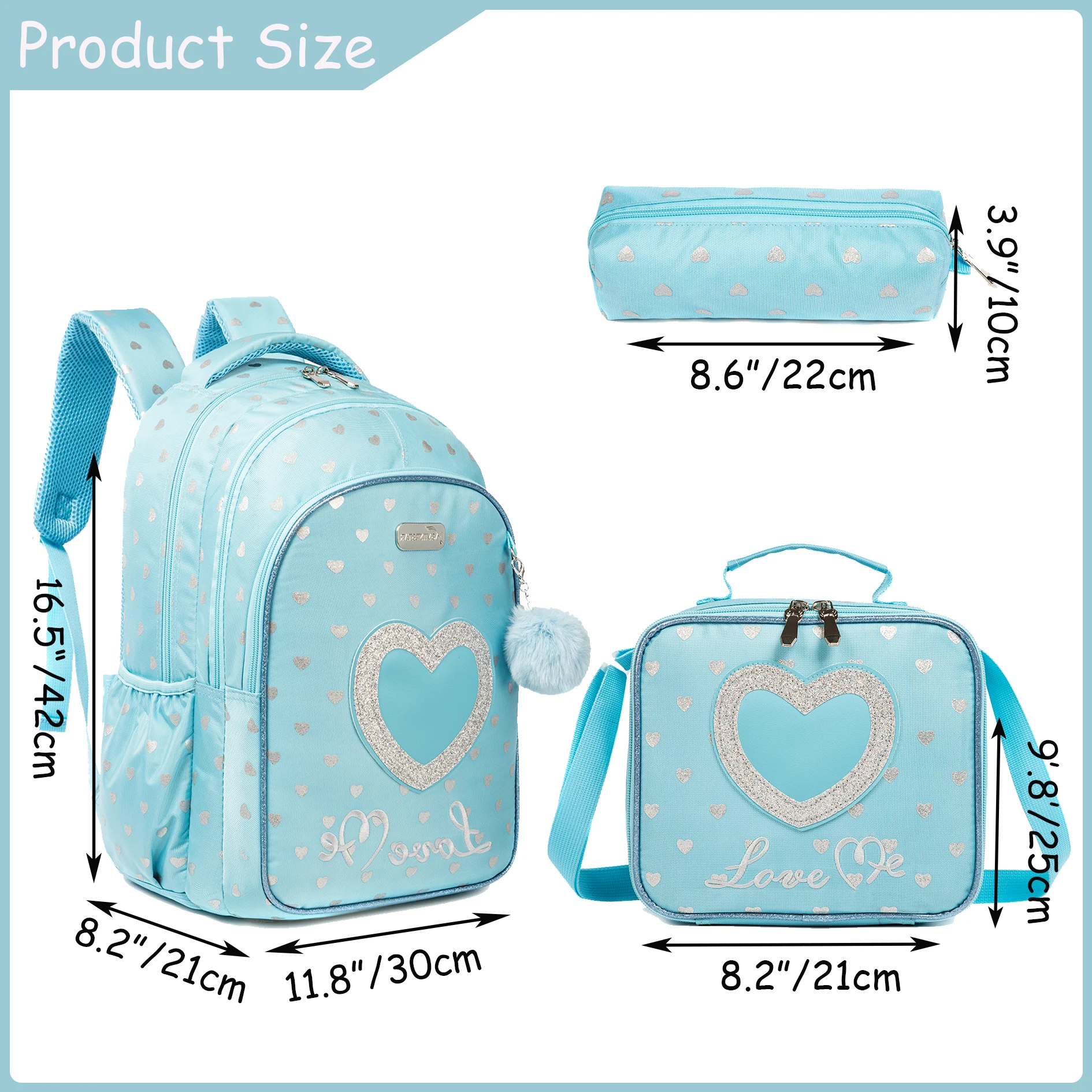 ????????【Dimensioni zaino per ragazze】 Zaino principale 3 in 1: 16,5″x 11,8″x 8,2″, portapranzo: 9,8″x8,2″x 3,9″, astuccio: 8,6″x 3,9″.Lo zaino ha un spazio sufficiente per accumulare tutto, lei necessaria per la scuola senza essere troppo pesante sulle spalle.