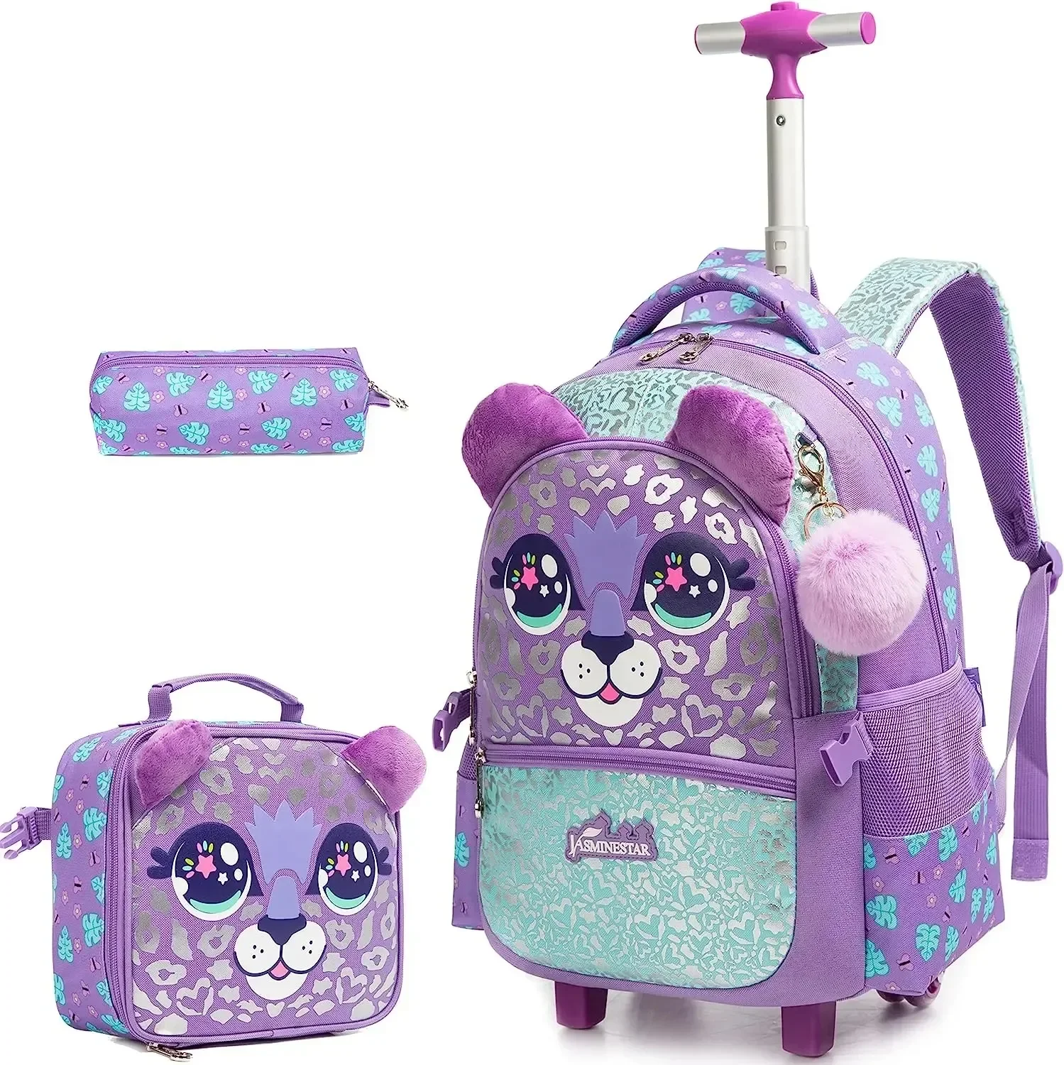 【Zaino con rotelle per ragazze dal design unico】Questo zaino con trolley ha fantastici modelli di cartoni animati sulla parte anteriore, è molto attraente ai bambini, denso e non facile da danneggiare, i modelli di panda e gatti sono stili alla moda che amati dai bambini ai momenti.