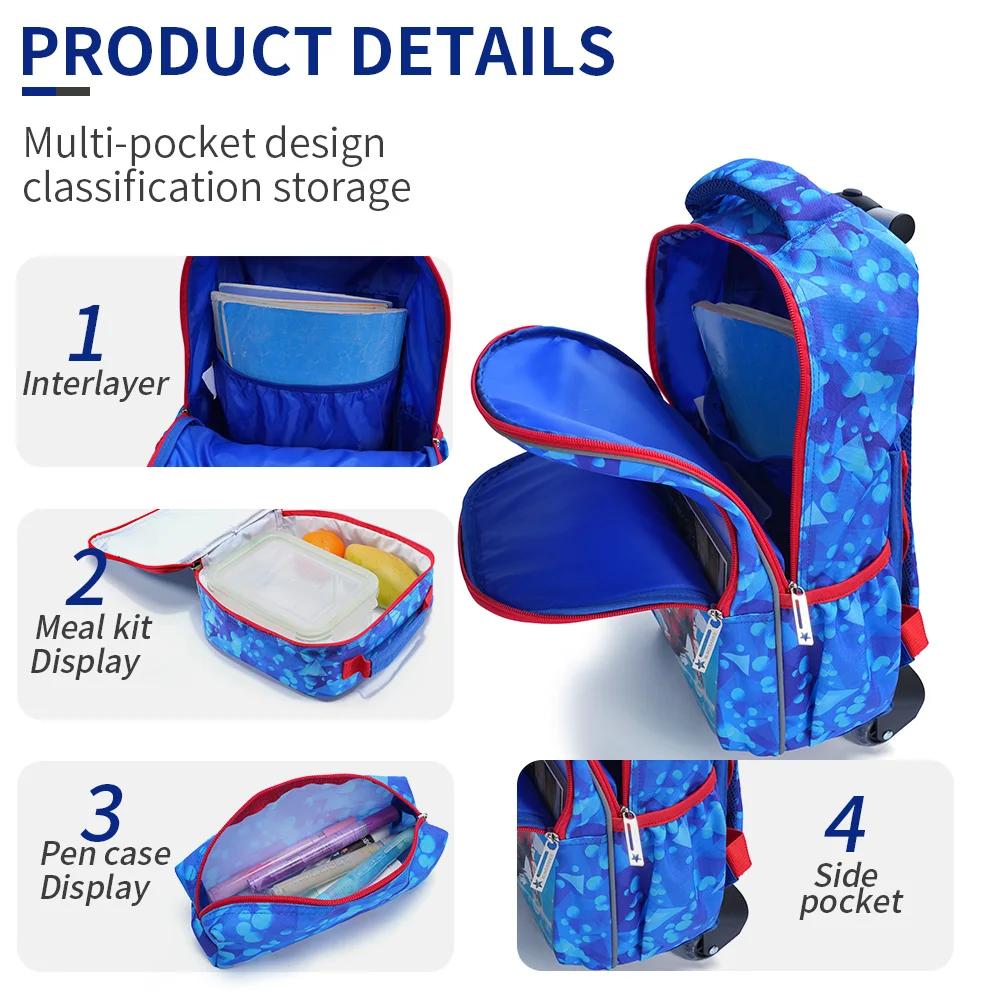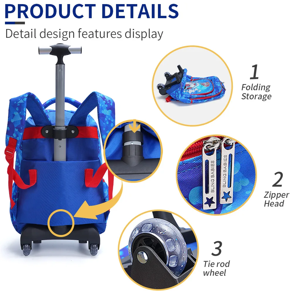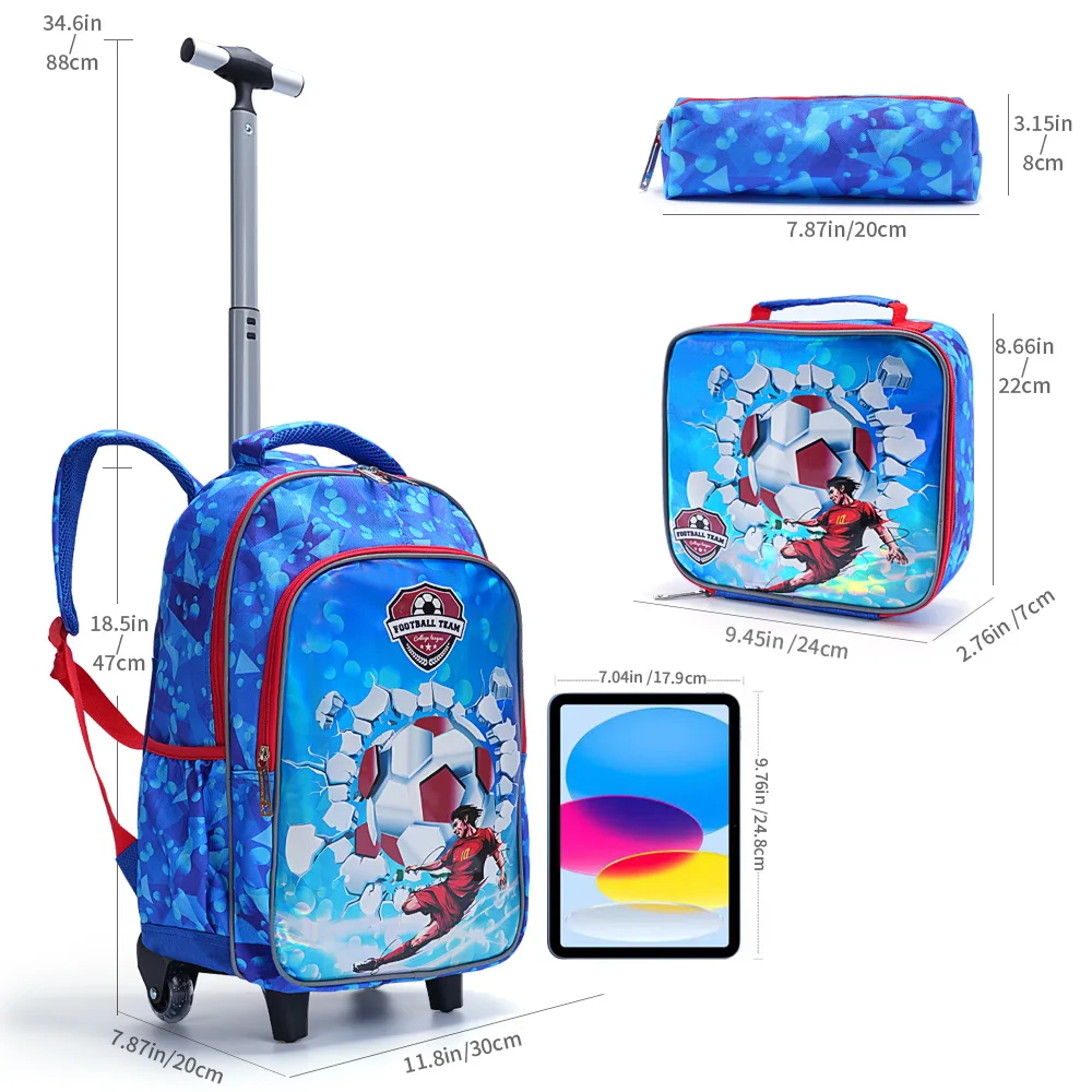 Zaino con ruote da 3 pezzi per ragazzi, design da calcio azzurro cielo, zaino scolastico con ruote, con pranzo e borsa per penne, funzione che si illumina al buio