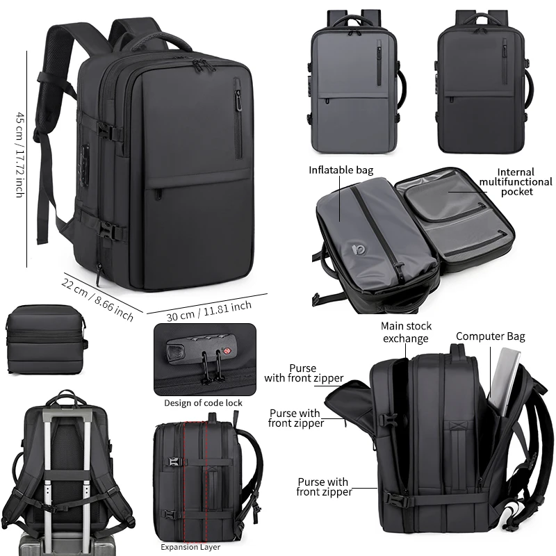 Zaino da viaggio con stoccaggio sottovuoto, borsa da trasporto per compagnia aerea, zaino per laptop aziendale e borsa tote per uomo e donna