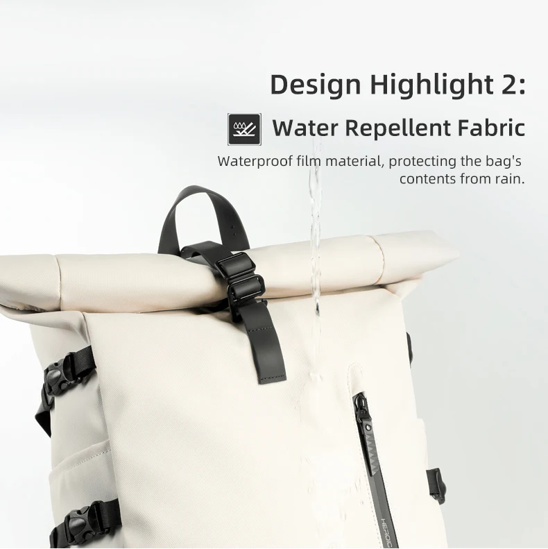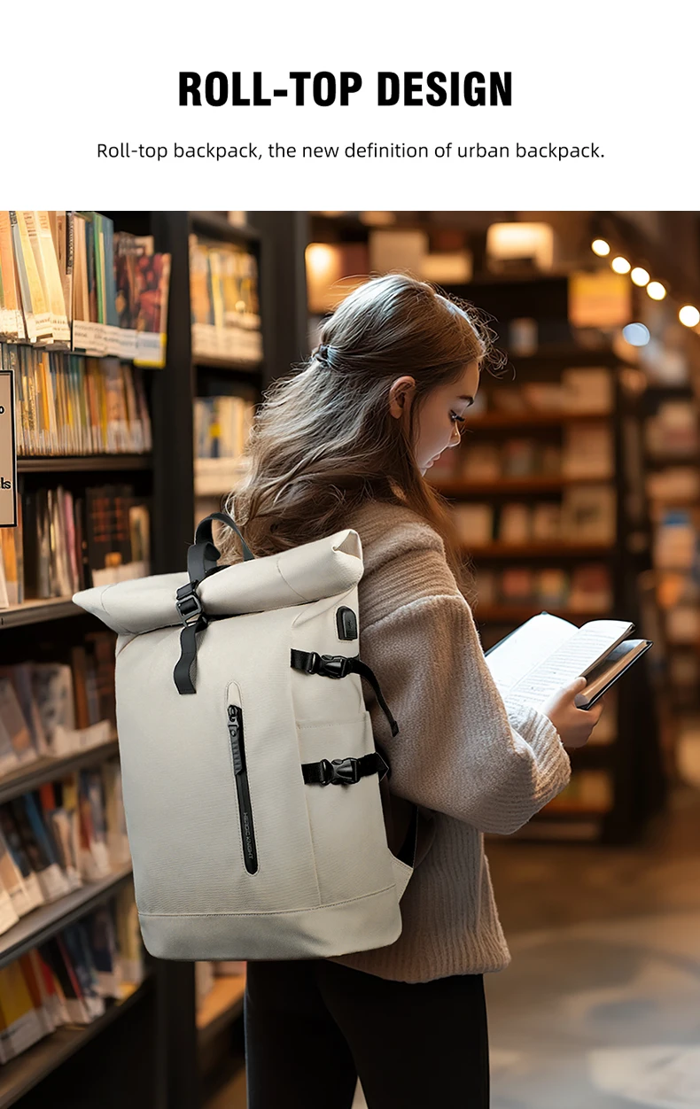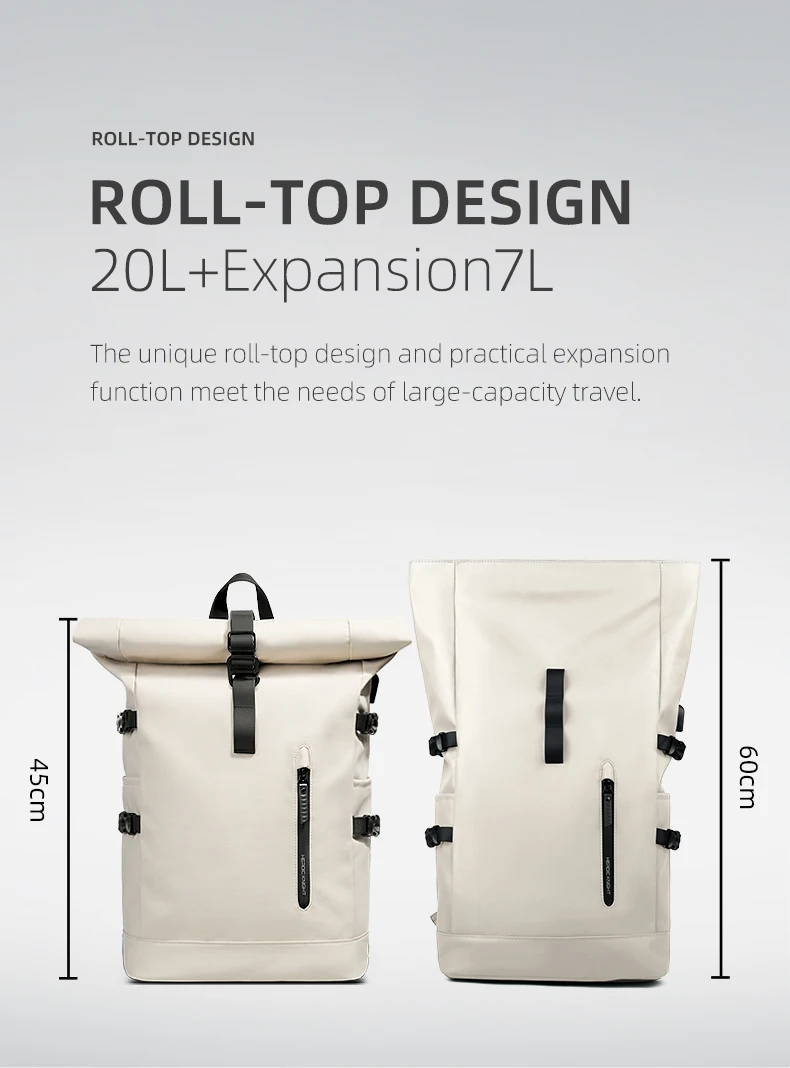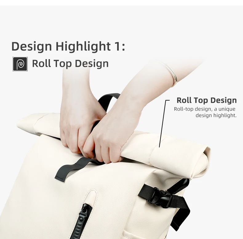 L’esclusivo design roll top non solo rende lo zaino più alla moda, ma semplifica anche la regolazione della capacità dello zaino per soddisfare le diverse esigenze di viaggio.