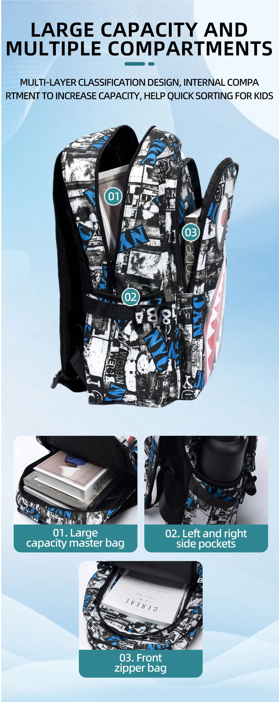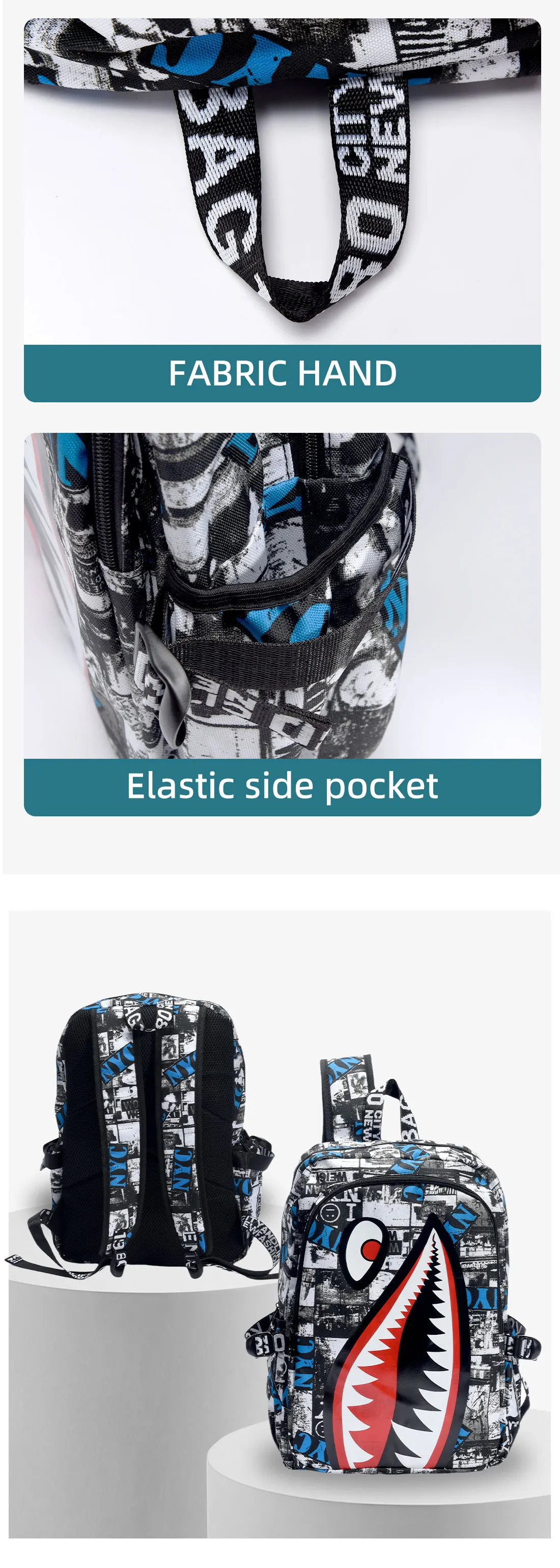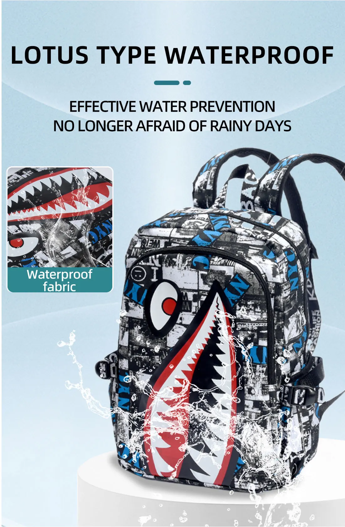 Zaino dal design alla moda con design a forma di squalo Zaino da uomo impermeabile e durevole Zaino per adolescenti di grandi dimensioni con ricarica USB Borsa a tracolla maschile