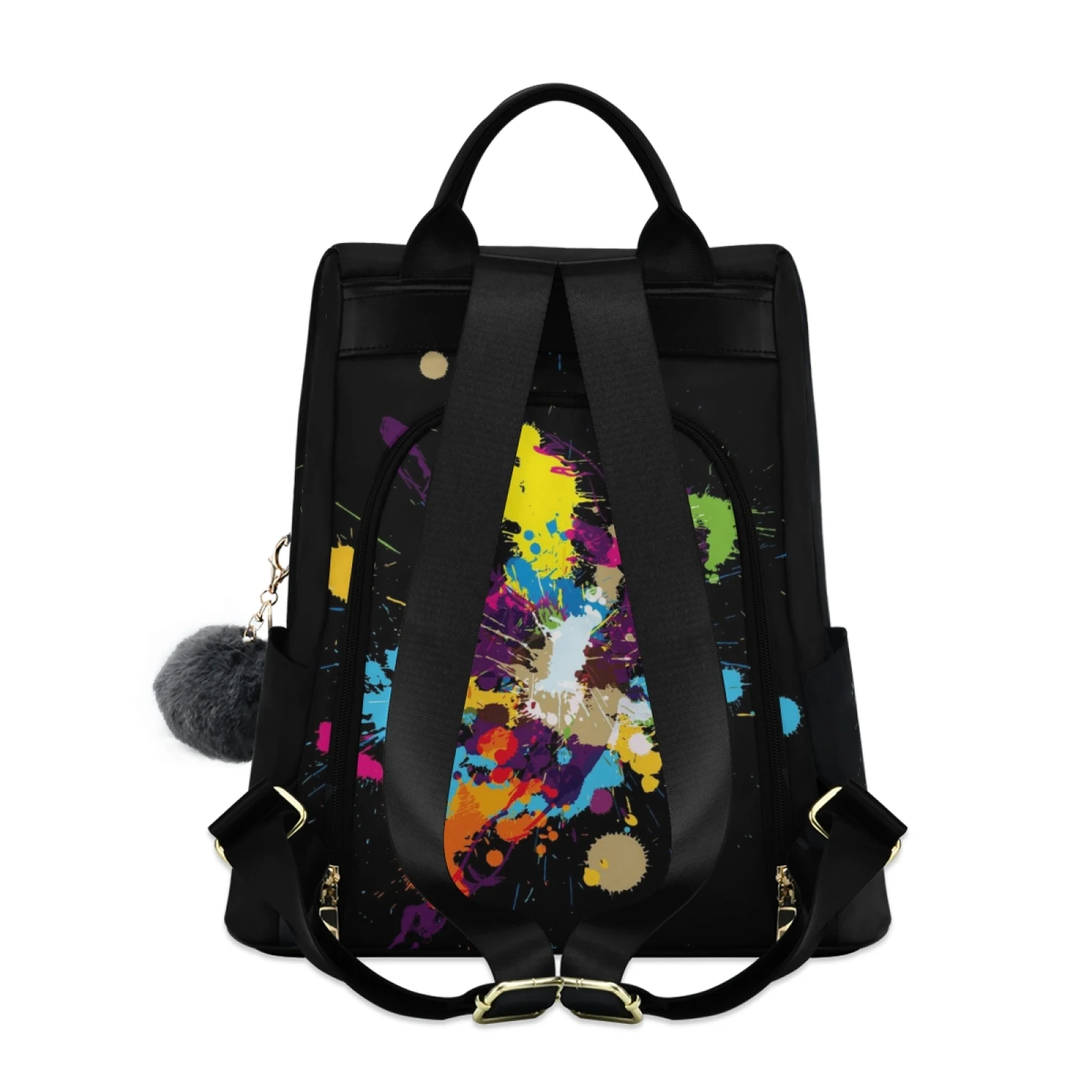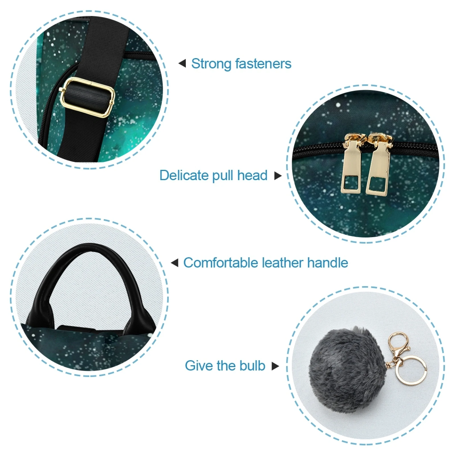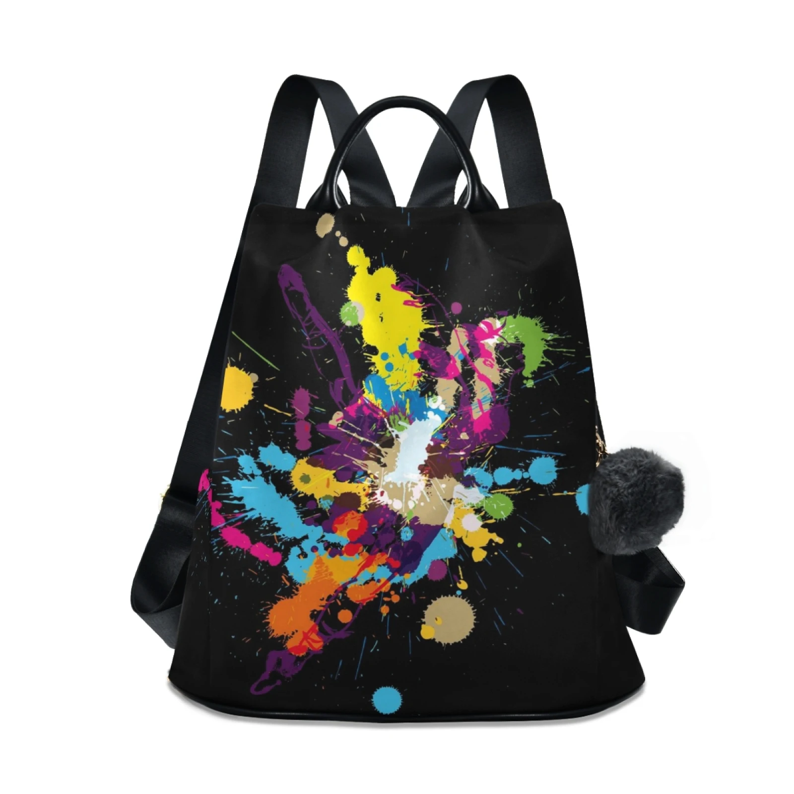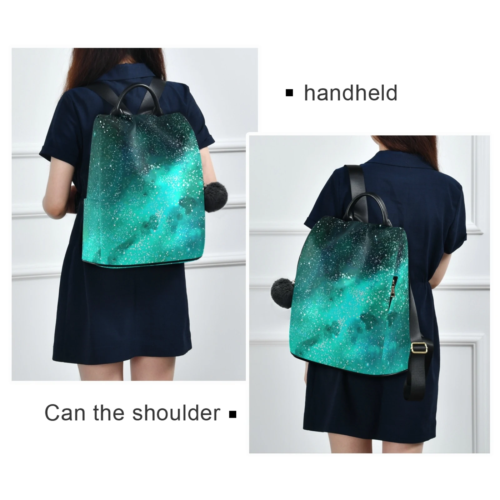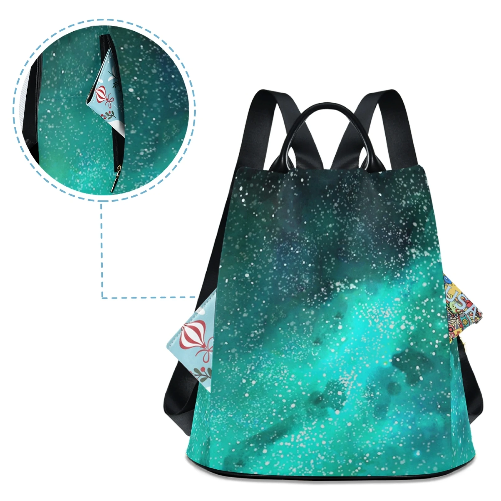 :The body of the bag is fully printed, and the front is not divided, which can fully display the printed drawings; the main bag of the bag is zipped on the back, and there are two small pockets and a zipper bag inside the main bag; there are a zipper bag and a plug pocket on both sides of the bag, so the storage space is various, and the back opening main bag is anti-theft. Leather handle, high quality heavy strap, exquisite pull head and fastener, and a plush ball key chain.