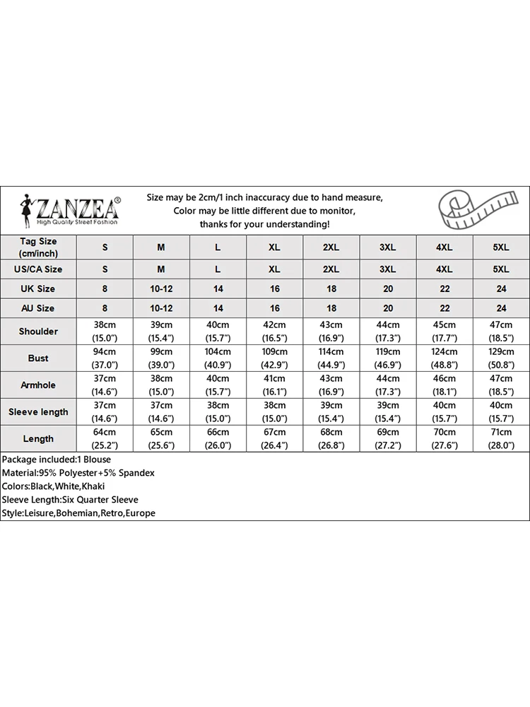 Il pacchetto include: 1 camicettaMateriale:95% poliestere+5% elastanColori: nero, bianco, kakiLunghezza manica: manica a sei quartiScollo: colletto rialzatoModello: tinta unitaCatena con fibbia: bottoni sul retroSpessore: sottileStile: tempo libero, bohémien, retrò, EuropaStagione: primavera, estate, autunnoOccasione: famiglia, festa, spiaggia, matrimonio, vacanze, impiegoEtichetta: sìAttenzioni:1.L’oggetto reale può presentare leggere differenze di colore rispetto alle immagini visualizzate su computer diversi. Attenzione se ti dispiace, grazie.2. Potrebbe esserci un errore di misurazione manuale di 1-3 cm. Ci scusiamo per qualsiasi inconveniente.3.Si prega di prevalere sull’oggetto reale, sulle immagini del modello solo come riferimento.4.Attenzione!! !Si prega di controllare attentamente la tabella delle taglie prima di effettuare l’ordine.