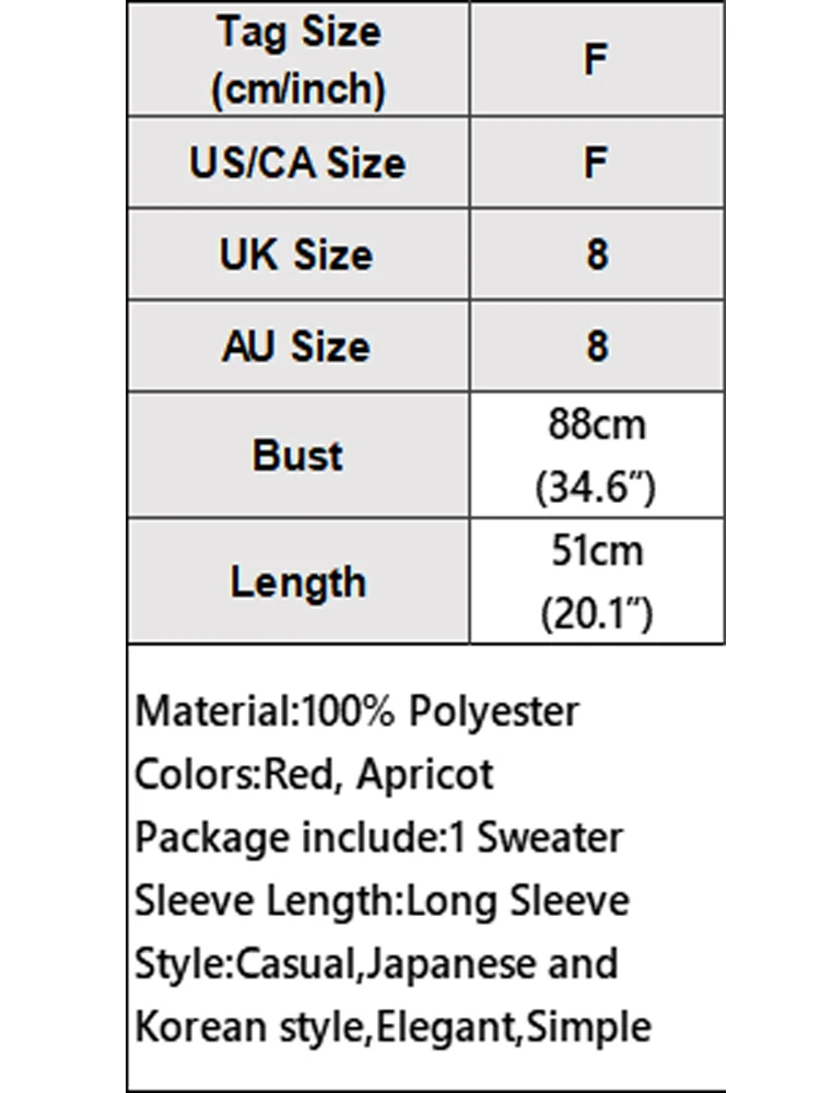Tipo di articolo: maglione Materiale: 100% poliestere Colori: rosso, albicocca Il pacchetto include: 1 * maglione Taglio: normale Allungamento: non estensibile Caratteristiche: maglione pullover con bottoni in tessuto di lana a maniche lunghe con risvolto Spessore: standard Stile: casual, pendolarismo Stagione: primavera, autunno, inverno Occasione: tutti i giorni, ufficio, vacanze, casa, casual, viaggi Attenzione: 1.A causa dei diversi computer, potrebbe esserci una sottile differenza di colore tra l’oggetto e l’immagine.Per favore, non sparare se ti dispiace.Grazie. 2.Potrebbe esserci un errore di misurazione manuale di 1-3 cm.Ti preghiamo di comprendere l’inconveniente. 3.Si prega di fare riferimento all’oggetto reale.Le immagini del modello sono solo di riferimento. 4. Attenzione!!! Si prega di controllare attentamente la tabella delle taglie prima di ordinare.