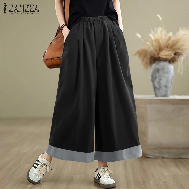 ZANZEA Pantaloni in denim casual Donna Elastico in vita Pantaloni lunghi a gamba larga Tasche Abbigliamento da lavoro Moda Pantaloni patchwork larghi Estate