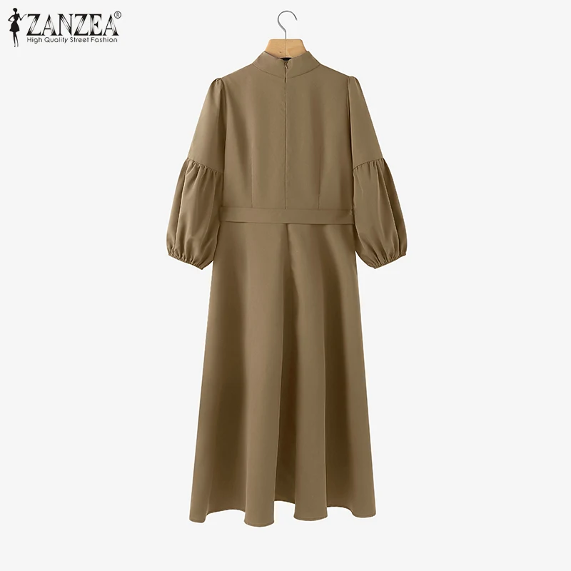 ZANZEA Vintage Donna A-Line Abiti longuette Elegante Chic Colletto alla coreana 3/4 Manica a lanterna Abito da donna con cintura Autunno 2025 Nuova moda