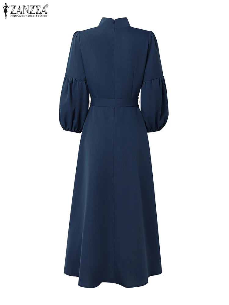 ZANZEA Vintage Donna A-Line Abiti longuette Elegante Chic Colletto alla coreana 3/4 Manica a lanterna Abito da donna con cintura Autunno 2025 Nuova moda
