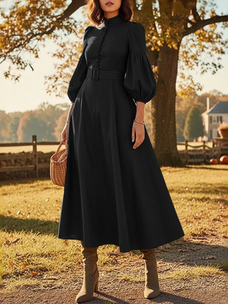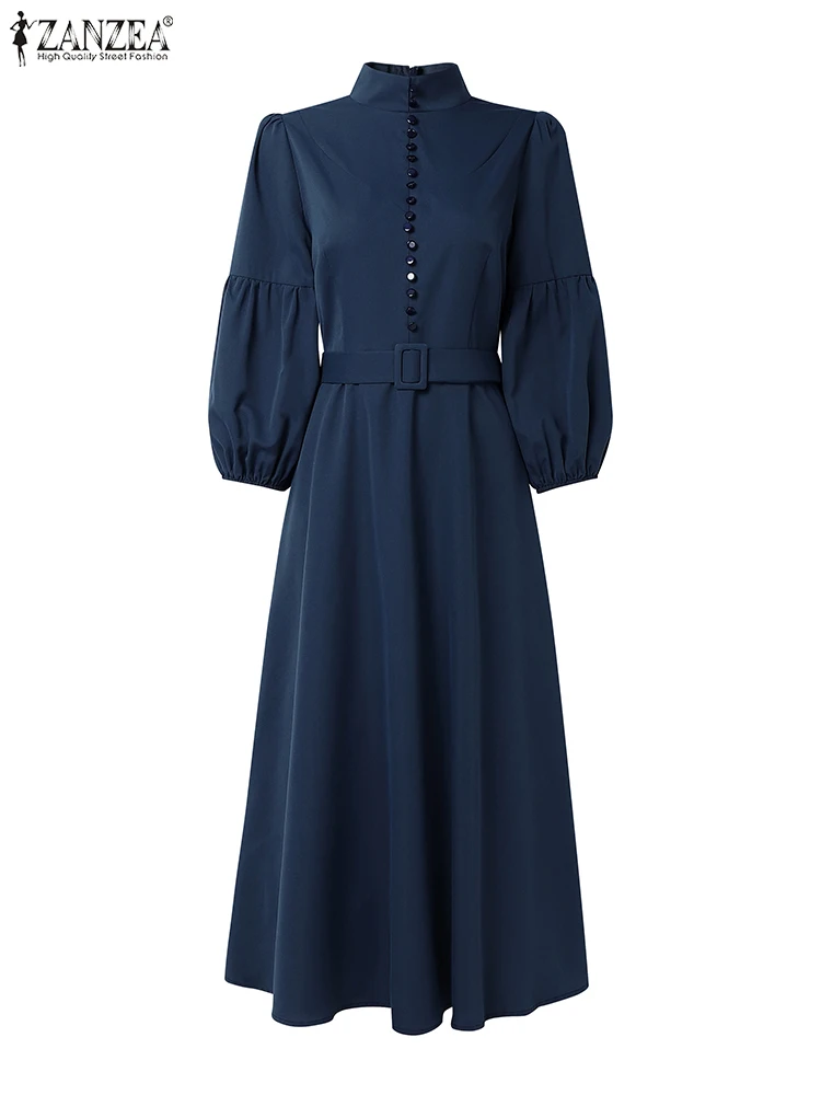 ZANZEA Vintage Donna A-Line Abiti longuette Elegante Chic Colletto alla coreana 3/4 Manica a lanterna Abito da donna con cintura Autunno 2025 Nuova moda 1ZANZEA Vintage Donna A-Line Abiti longuette Elegante Chic Colletto alla coreana 3/4 Manica a lanterna Abito da donna con cintura Autunno 2025 Nuova moda