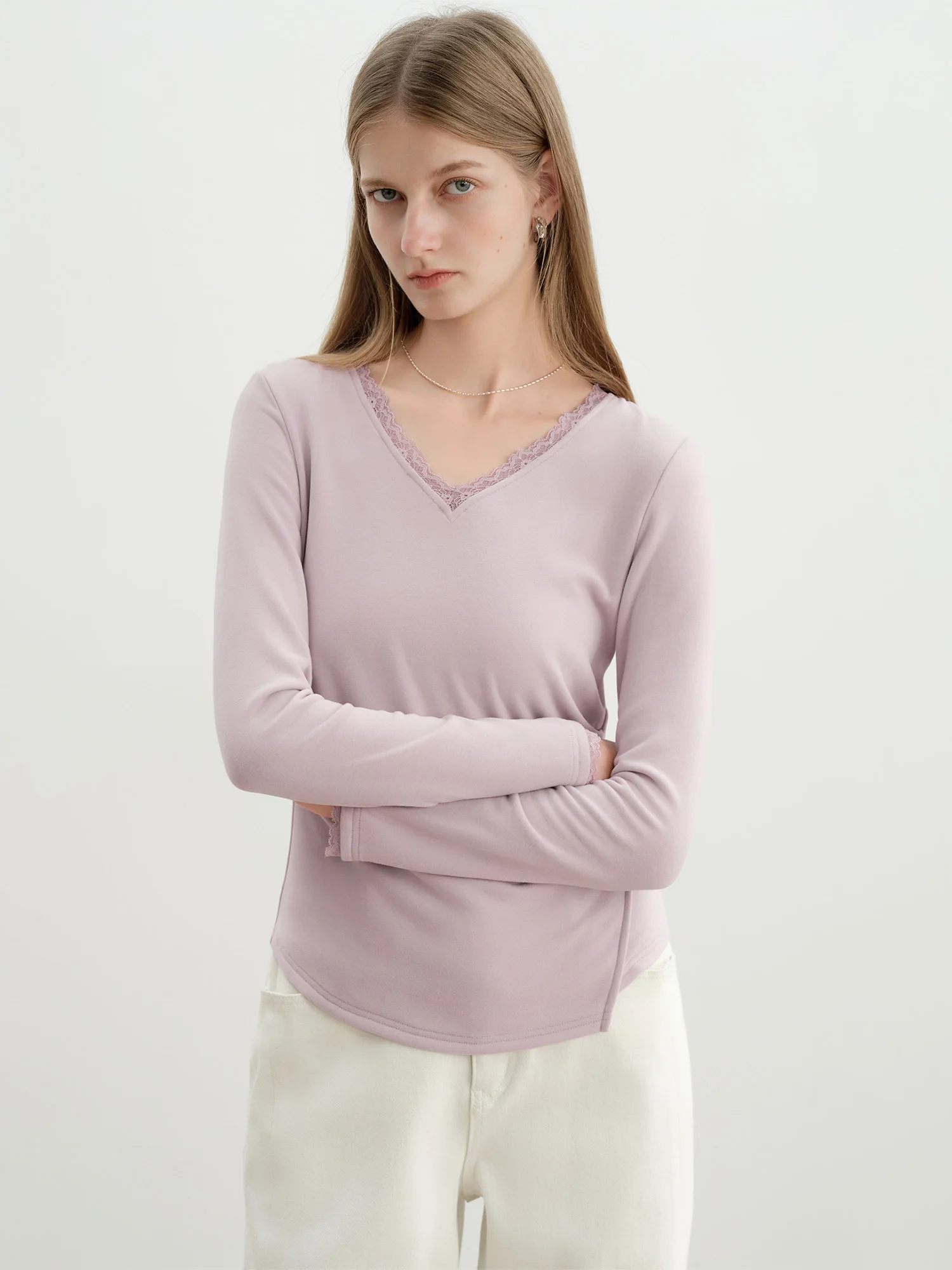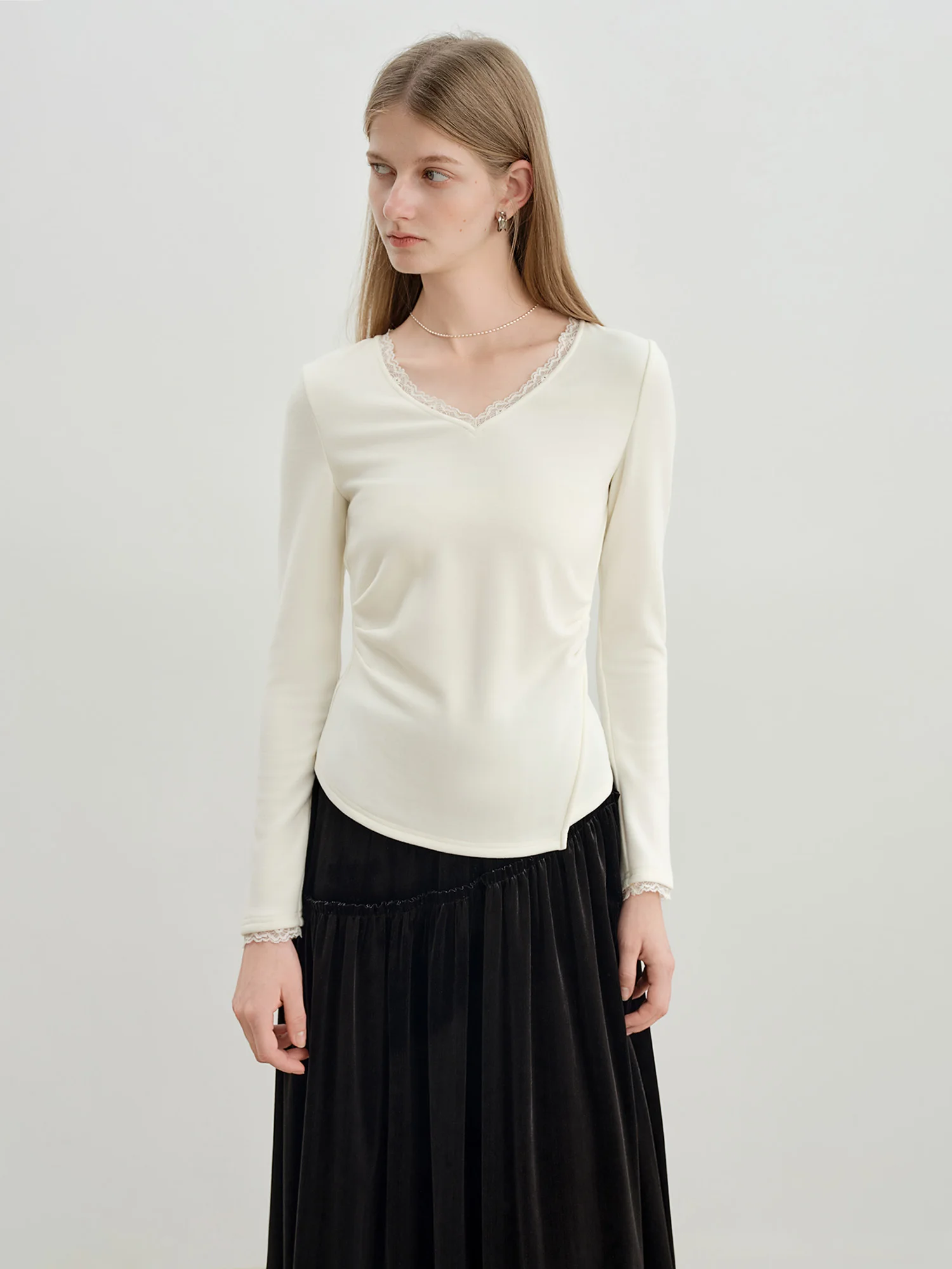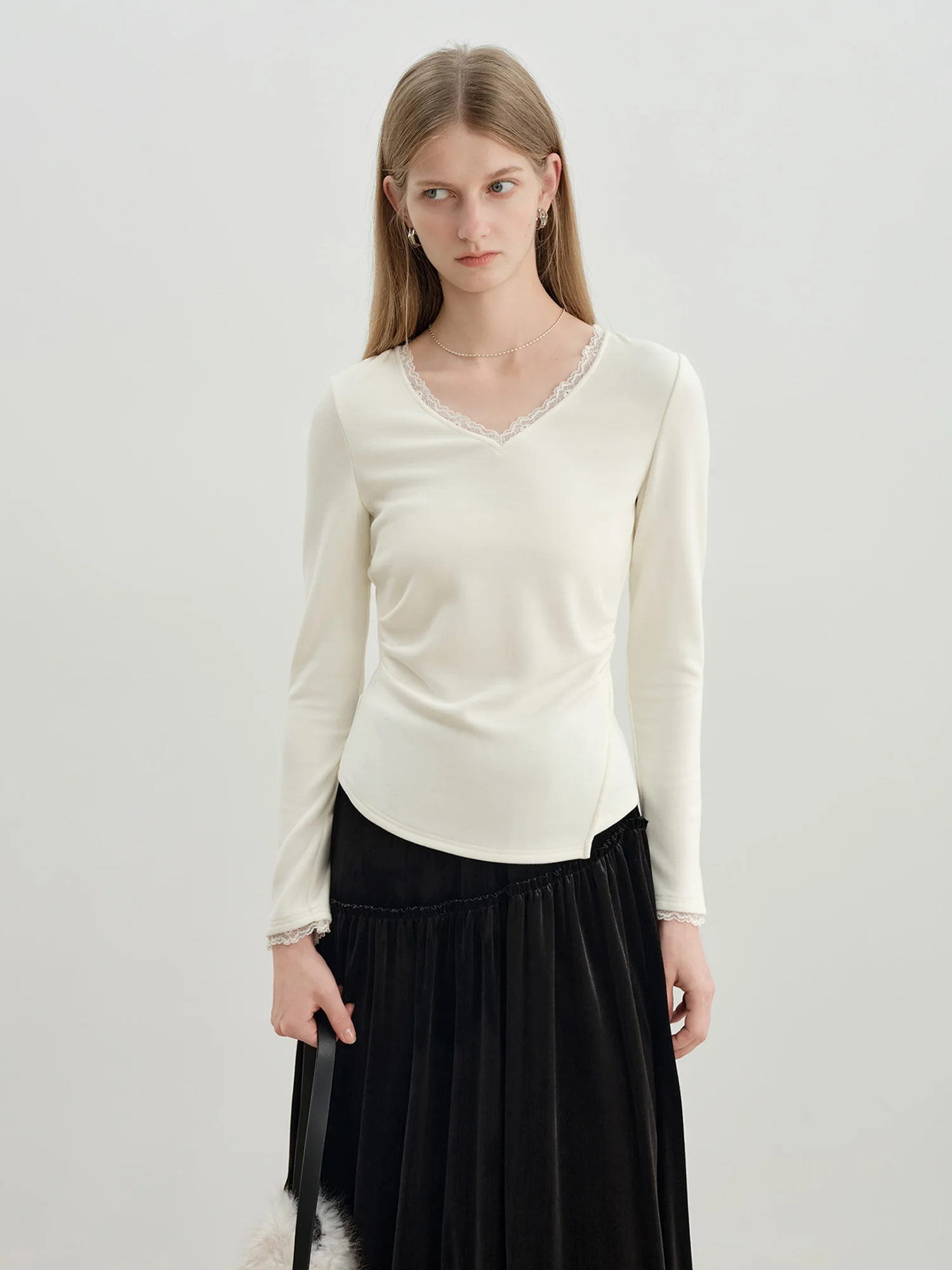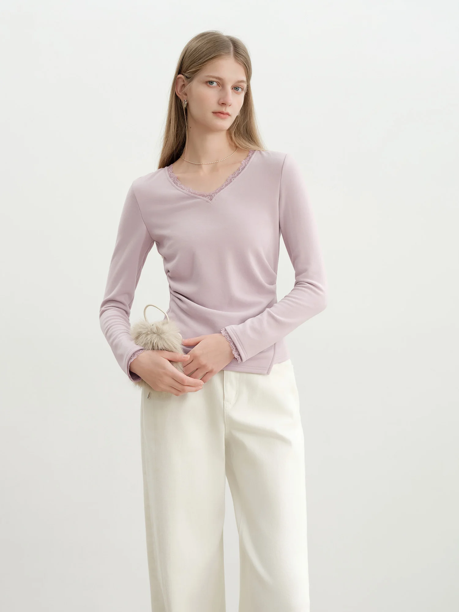 ZIQIAO 2025 T-shirt da donna autunno inverno con scollo a V e finiture in pizzo – Top slim fit definito in vita con morbido elasticizzato per il comfort casual