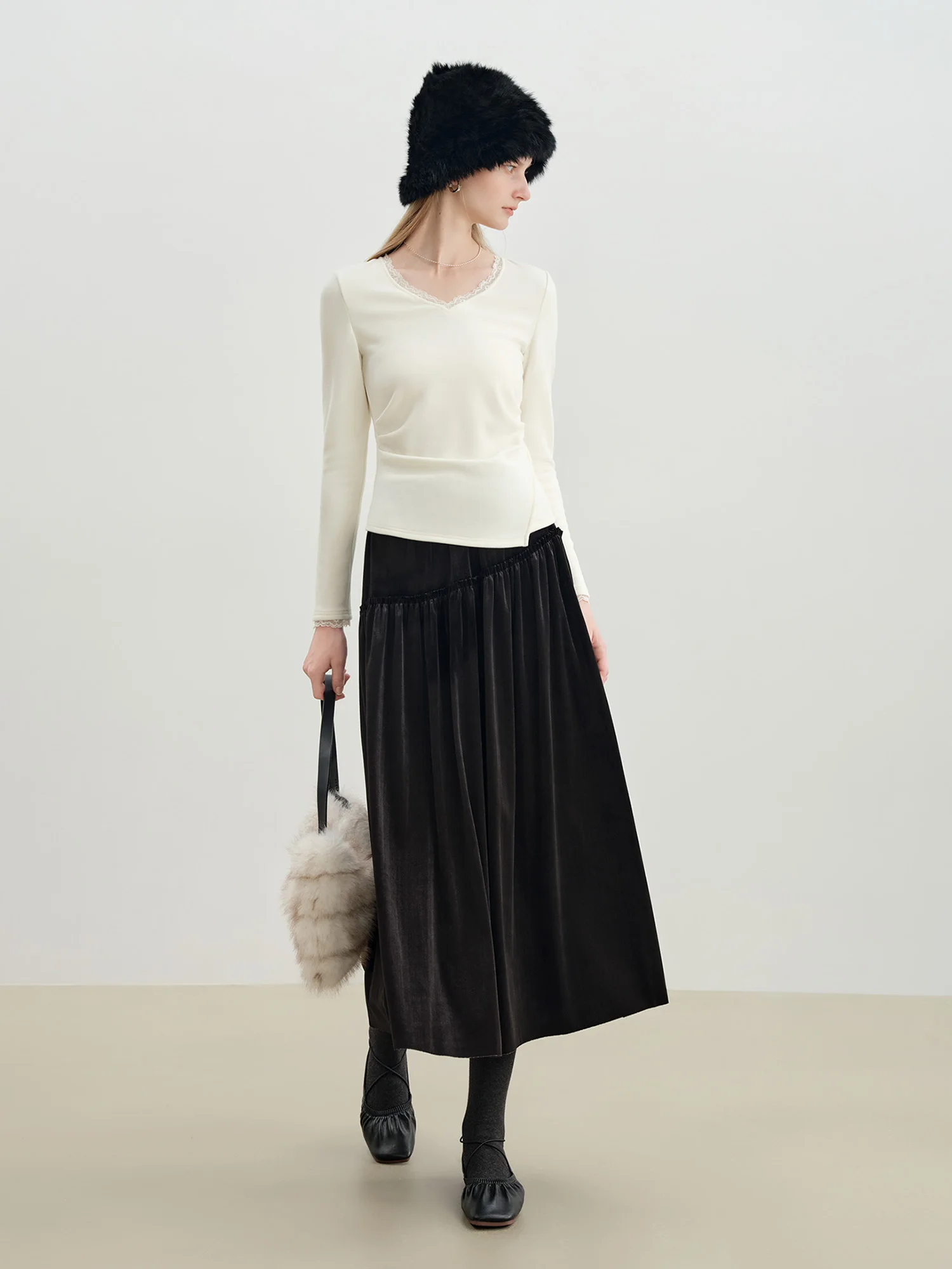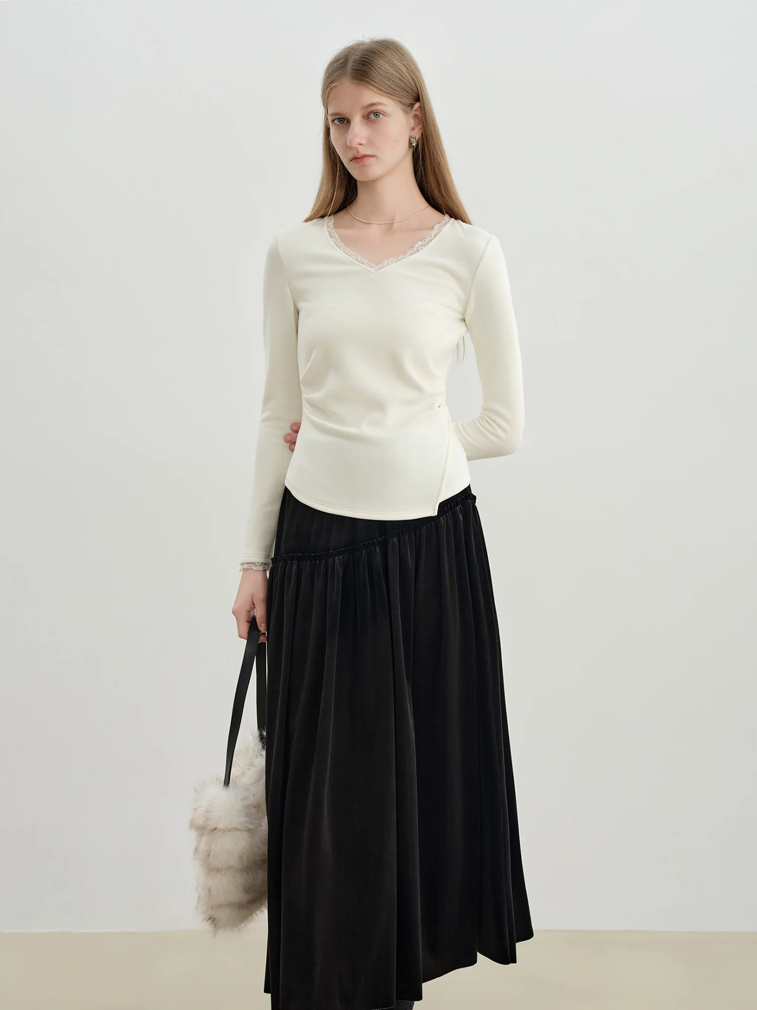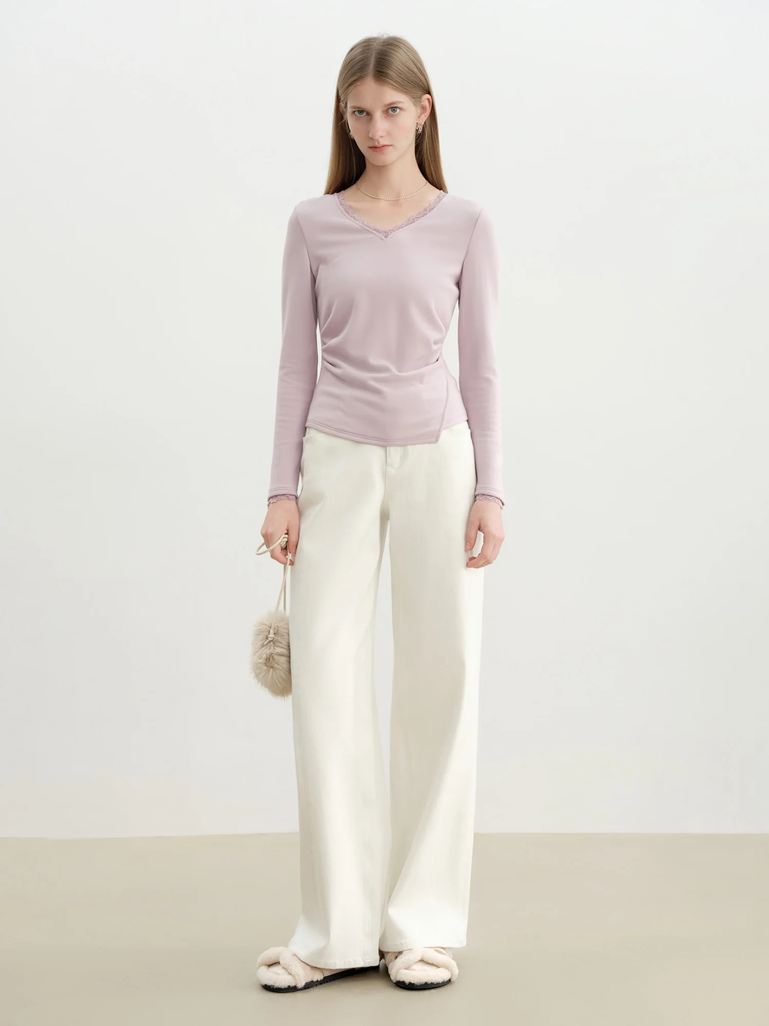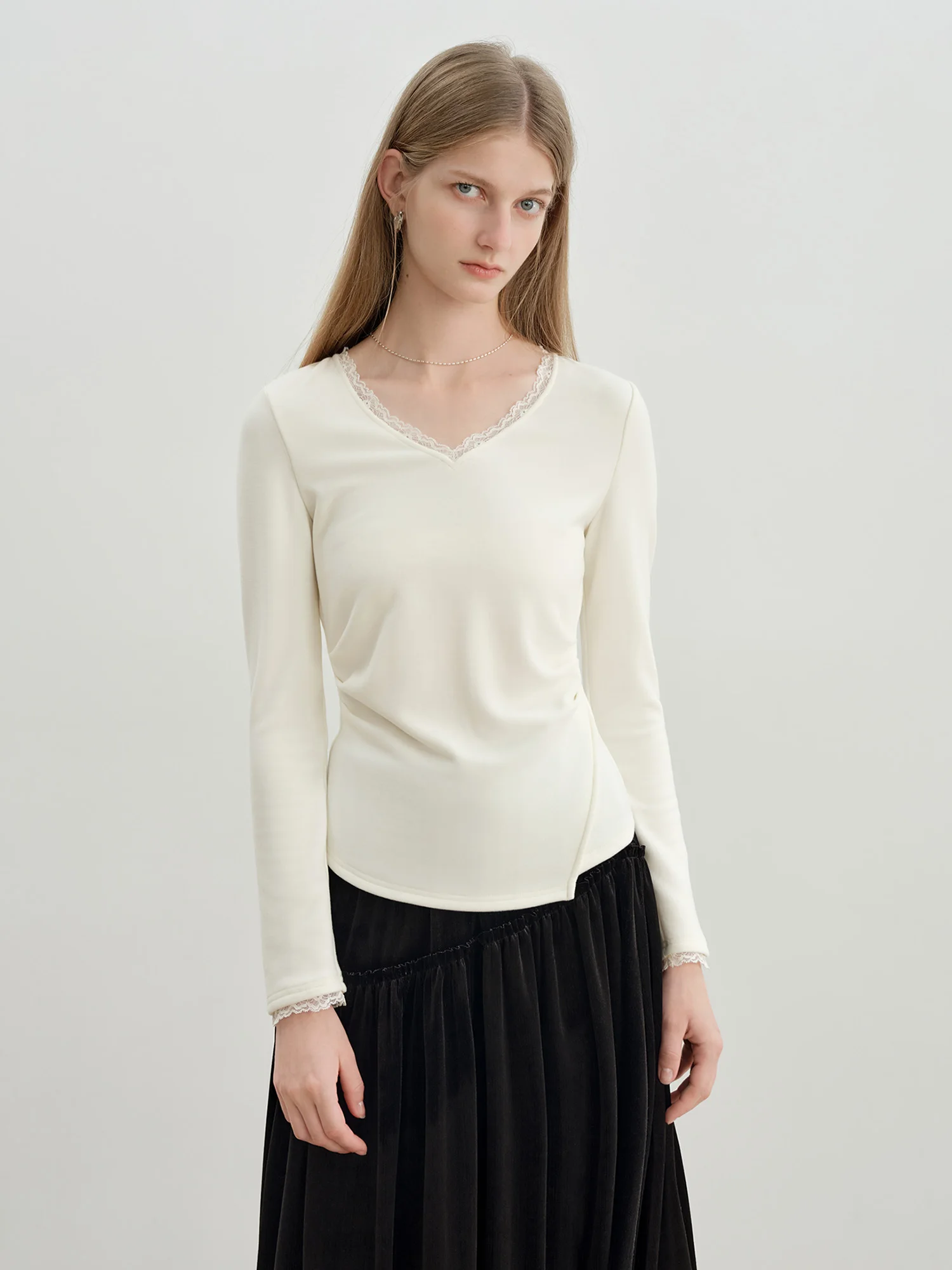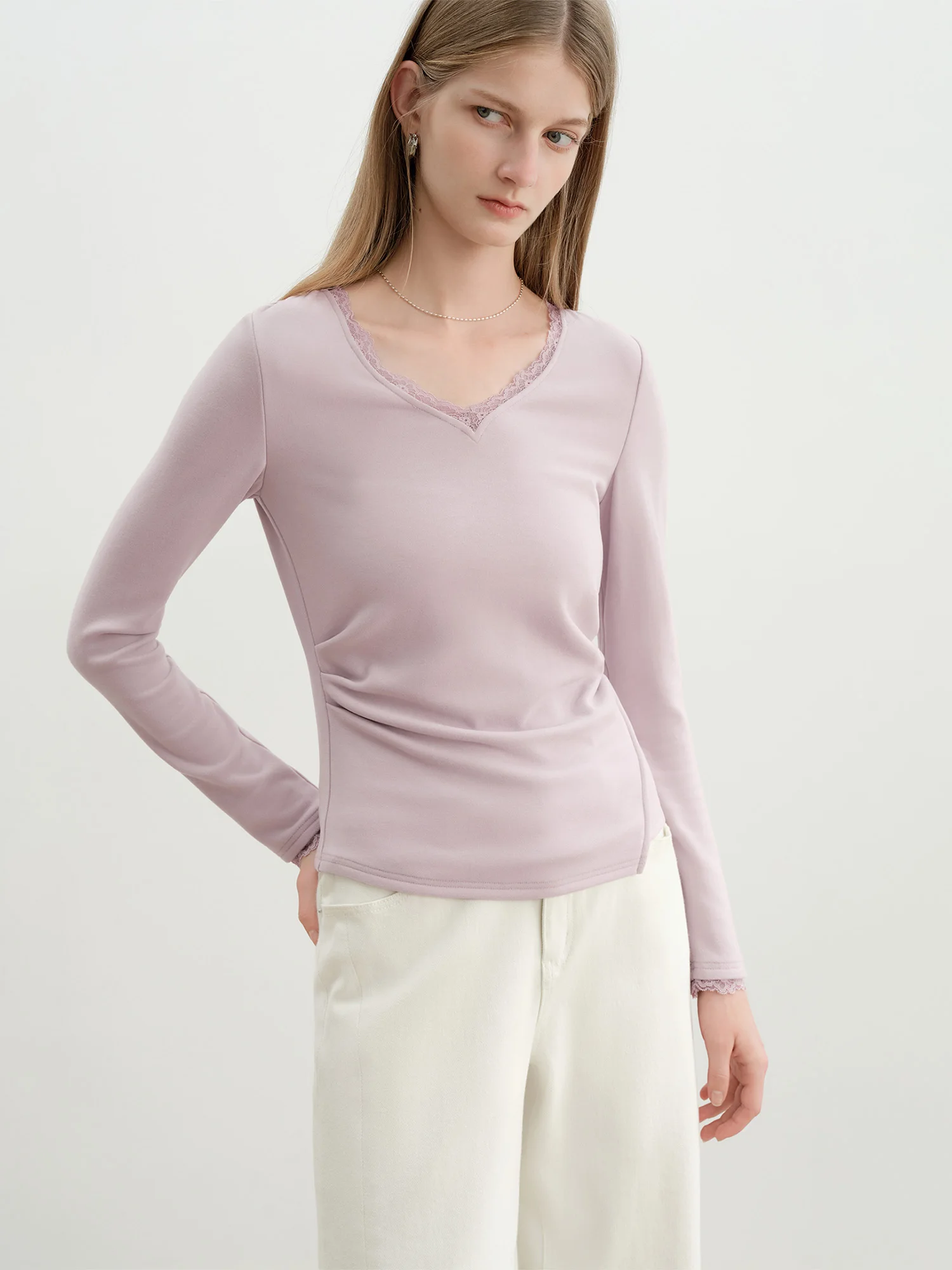 ZIQIAO 2025 T-shirt da donna autunno inverno con scollo a V e finiture in pizzo – Top slim fit definito in vita con morbido elasticizzato per il comfort casual