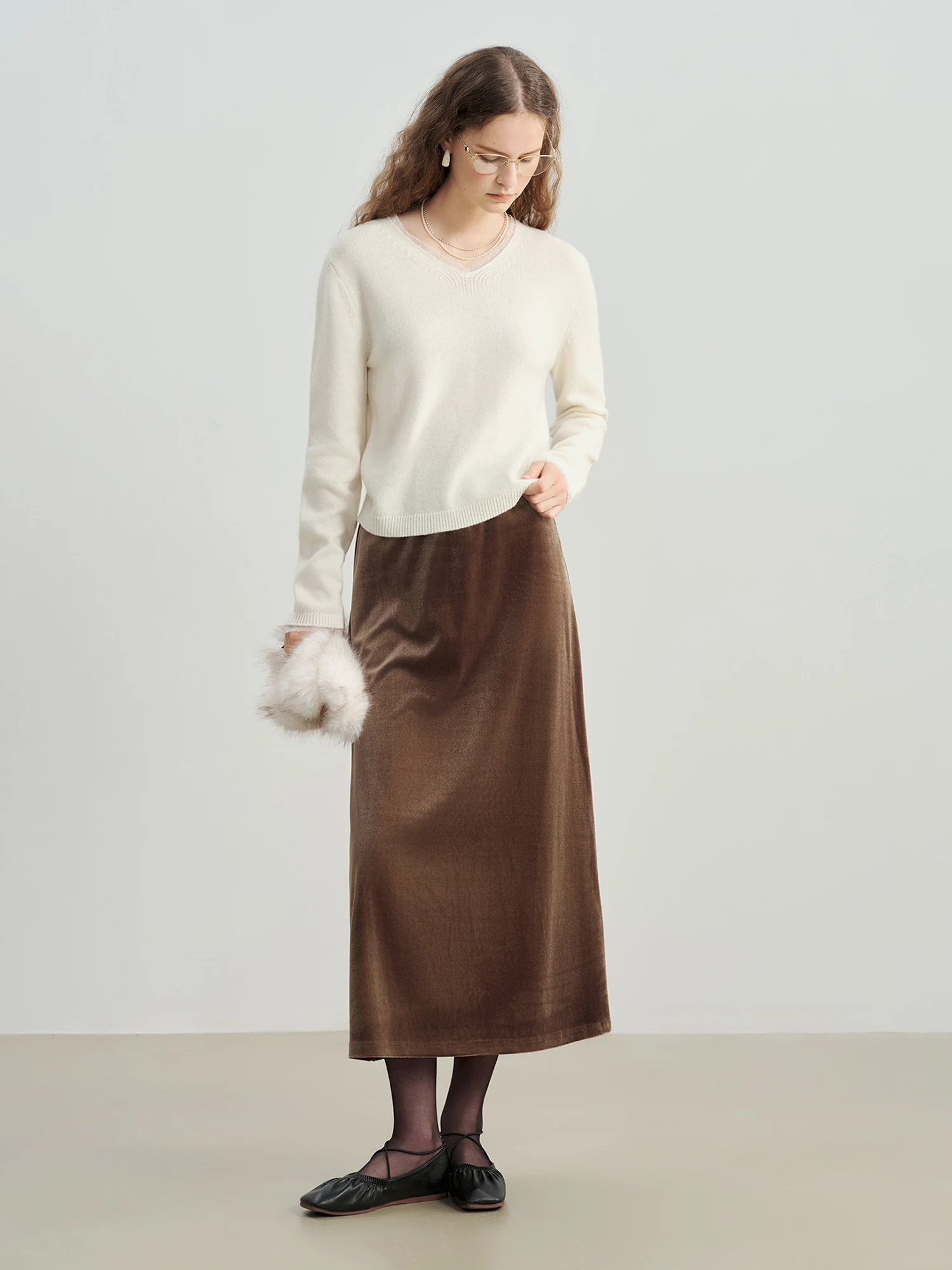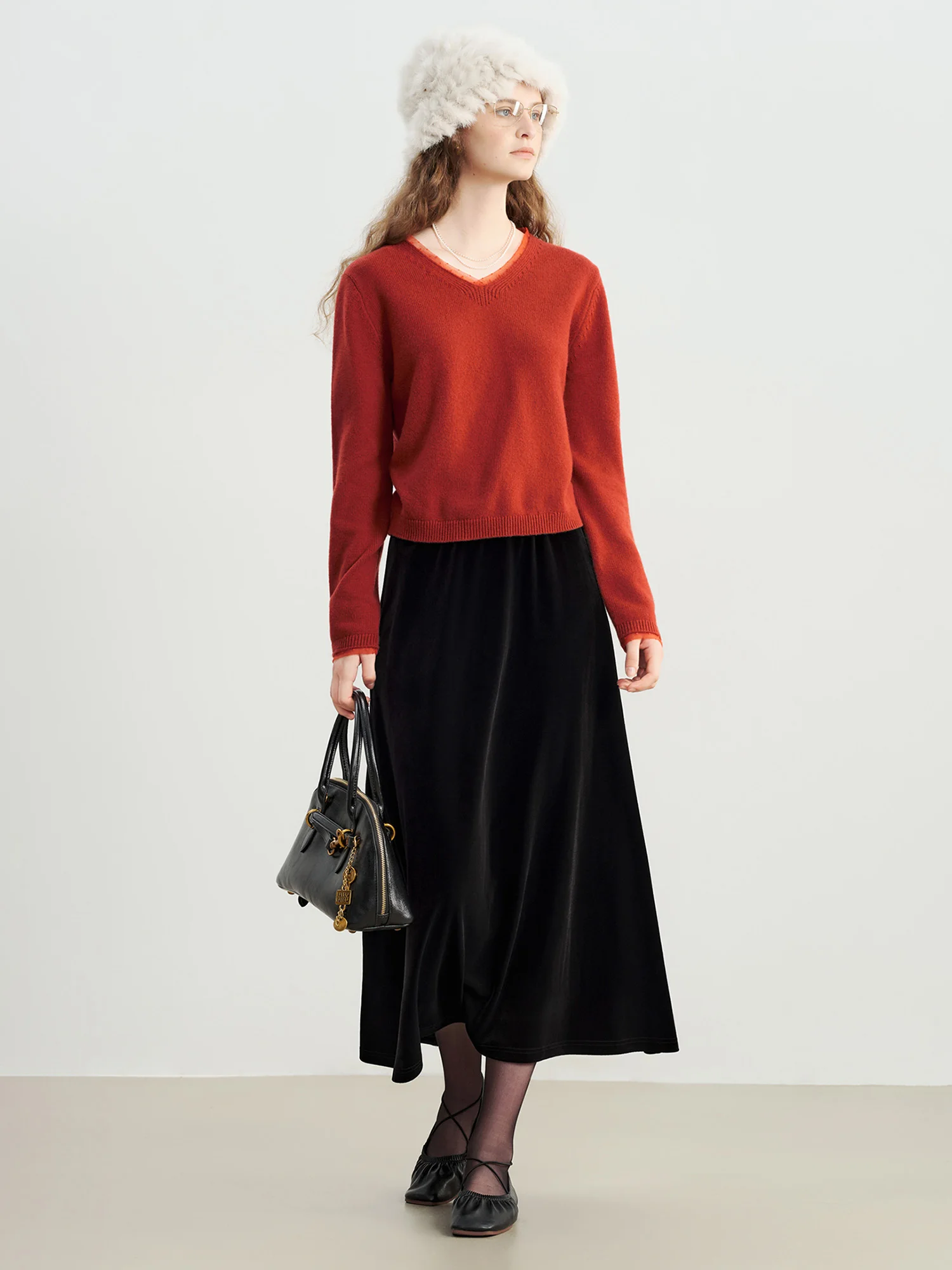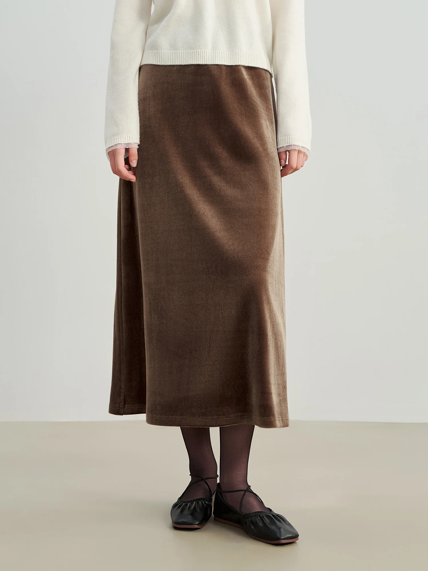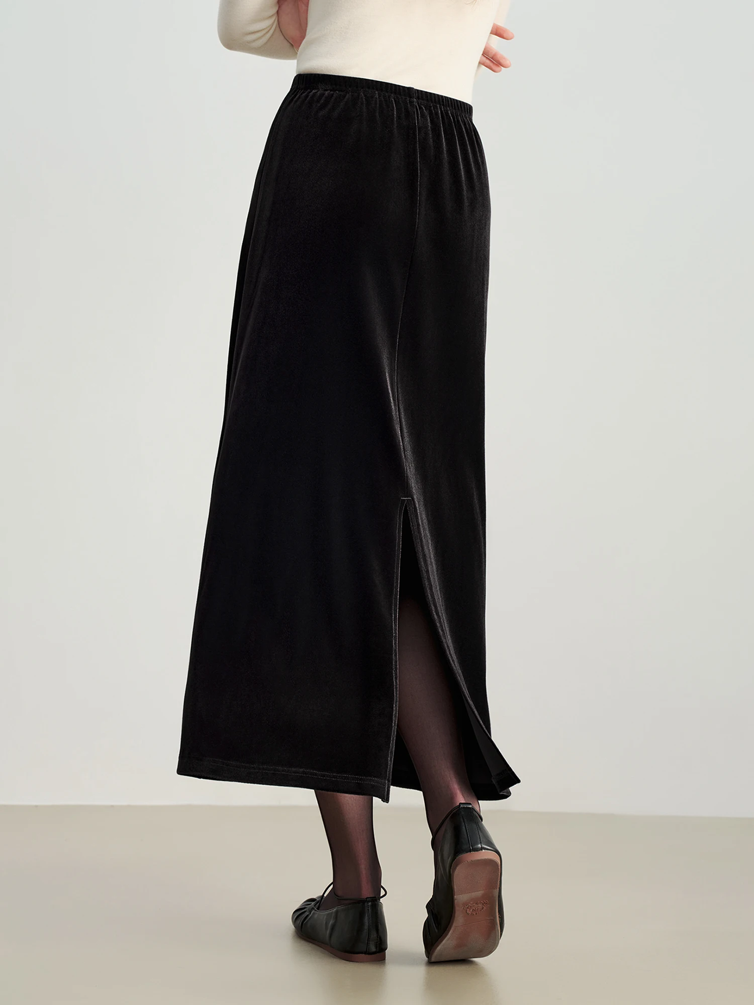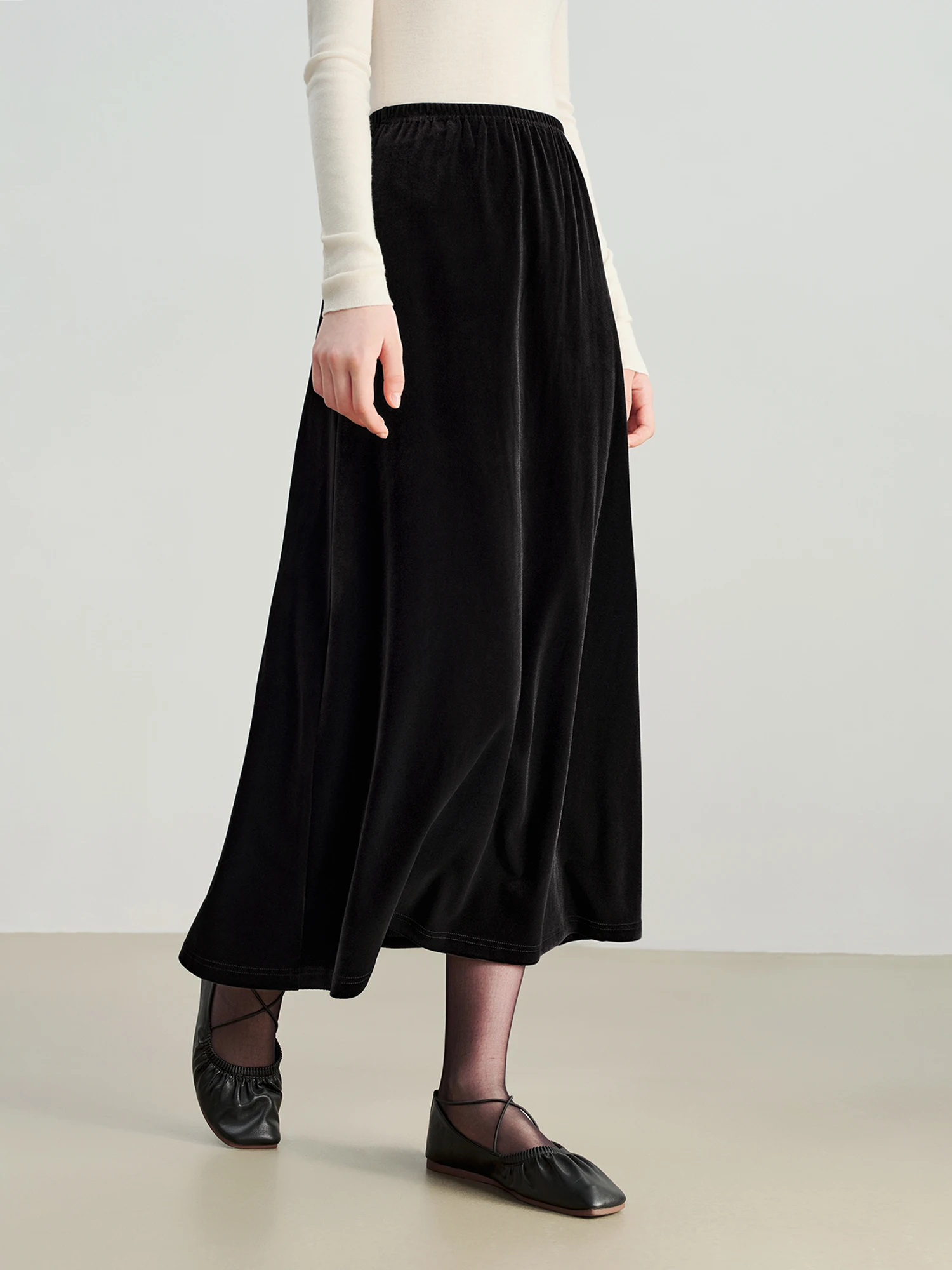 ZIQIAO Gonna longuette a trapezio in velluto nero stile francese per donna 2025 Autunno Inverno Nuovo senso di fascia alta con orlo lungo semi-gonna elegante
