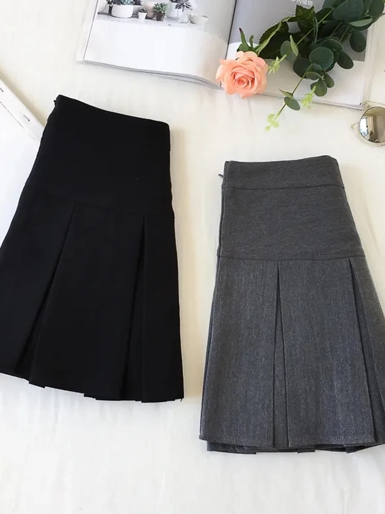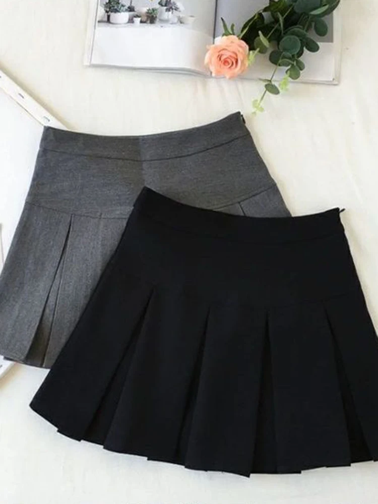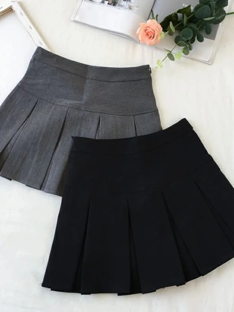 ZOKI Vintage grigio gonna a pieghe donna Kawaii a vita alta minigonne coreano moda scuola uniforme Harajuku Streetwear primavera